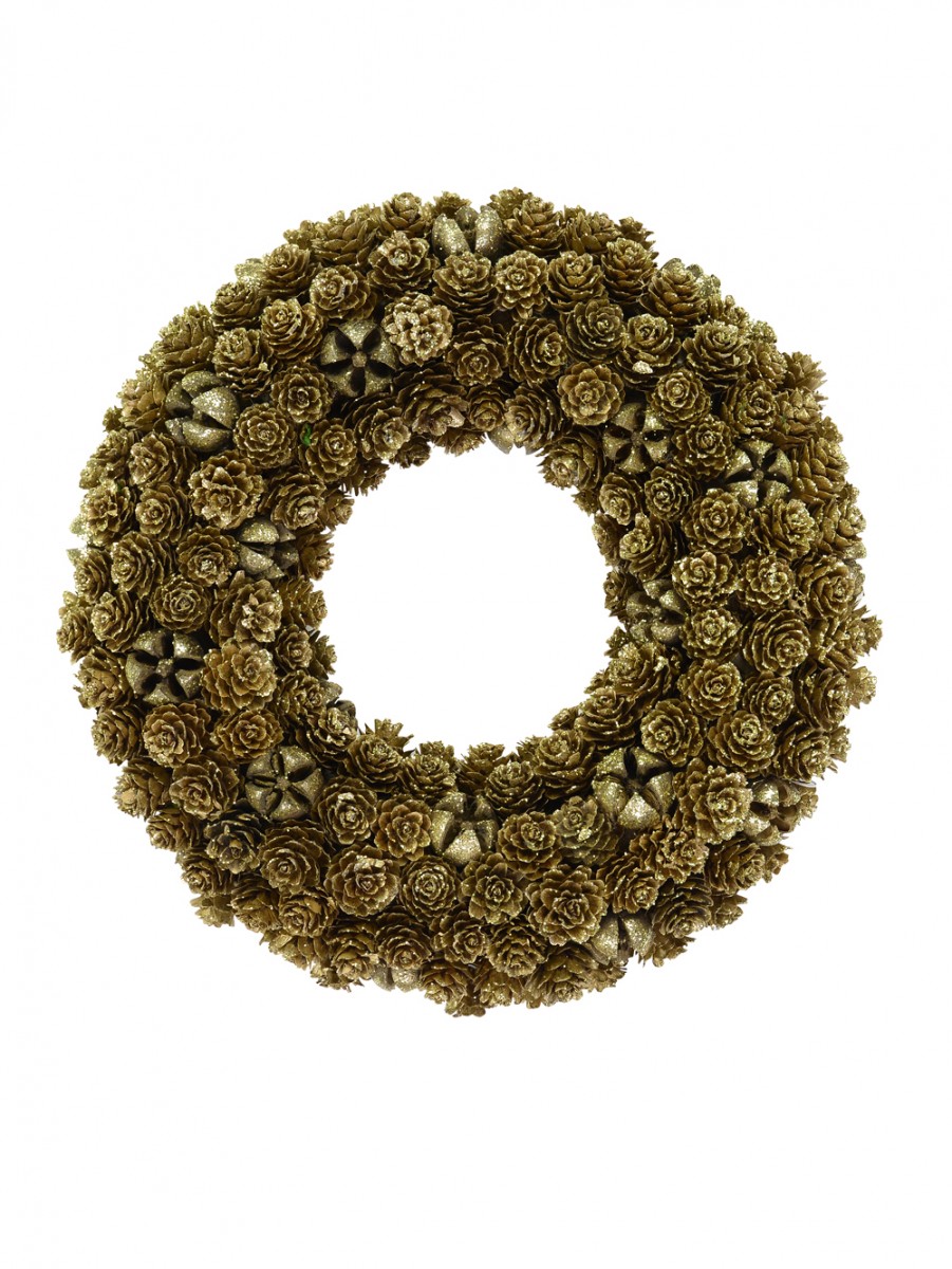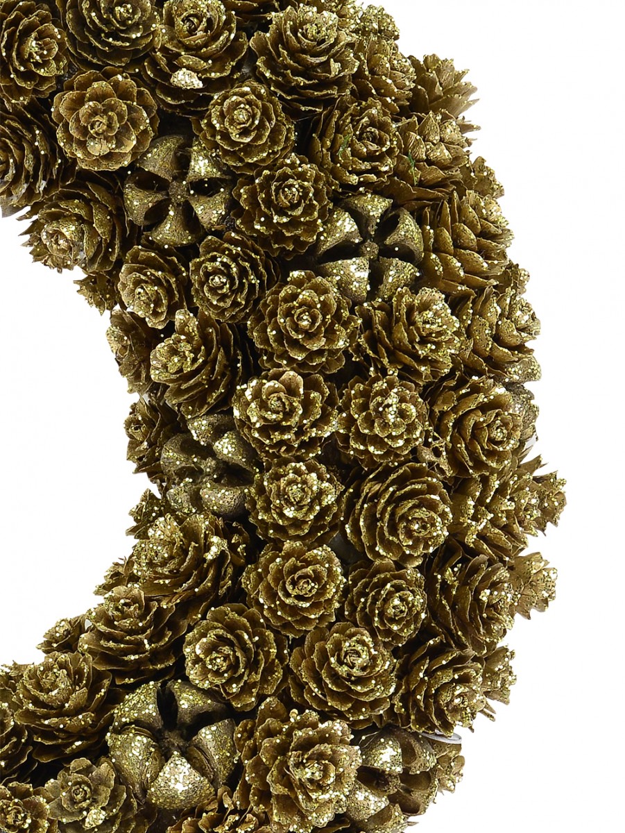 This seasonal decoration features rings of pinecones in a circular motion with cross fruit interspersed sporadically and it is dusted entirely in gold glitter to create a striking wreath. The pinecones and cross fruit are in pale gold colour giving a lovely vintage feel to the wreath and the dusted glitter gives a slightly frosted look adding to its charm.