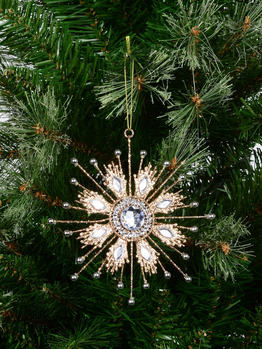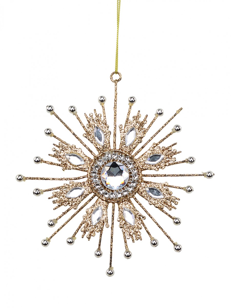 Did you know that snow is a natural decoration for Christmas? Snowfall during Christmas celebration is nature's way of decorating the season. It is always spectacular when the environment is all adorned in white. This is why this Gold Glitter Snowflake With Encrusted Diamante Hanging Ornament would make a suitable Christmas decoration item. It is made in gold coloured snowflakes pattern with the end points of some of the snowflake hands ending in silver coloured spherical ornaments. It also has 8 oval shaped diamantes extending from the centre of the snowflake. Also, surrounding the centre is several, differently shaped diamante which are spherical and surround a huge diamante which sits comfortably at the centre of all the others. These encrusted shiny diamantes give the already glamorous gold coloured snowflake a look of spectacular fascination.