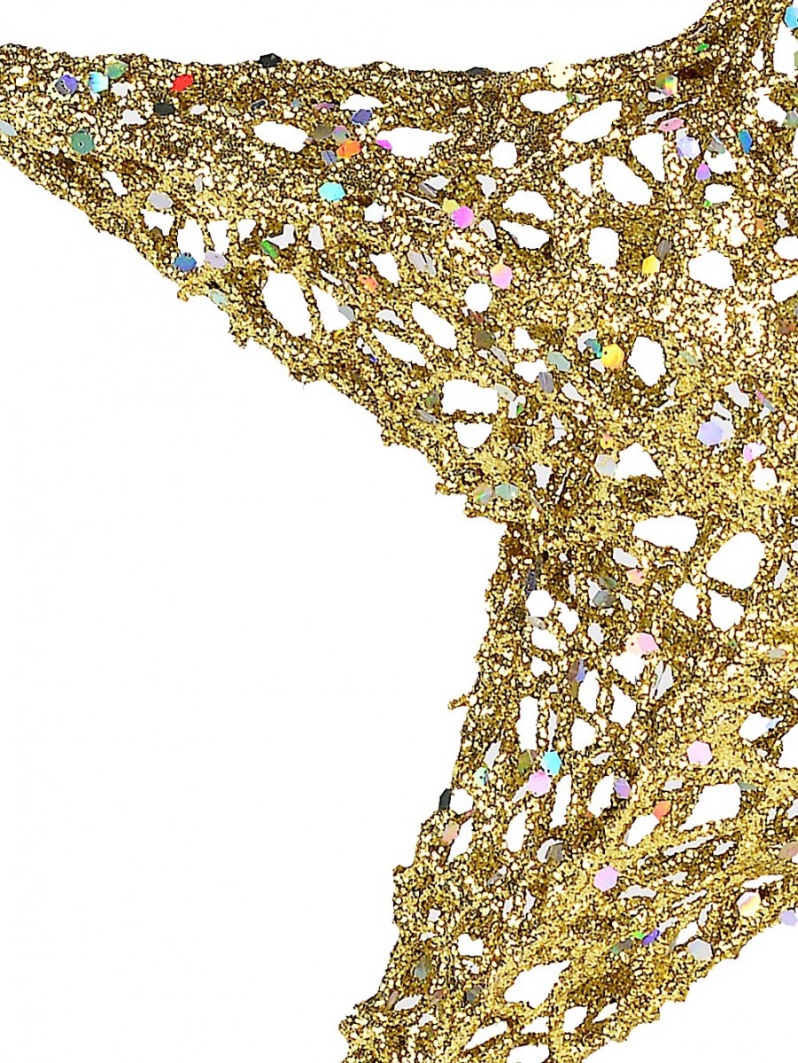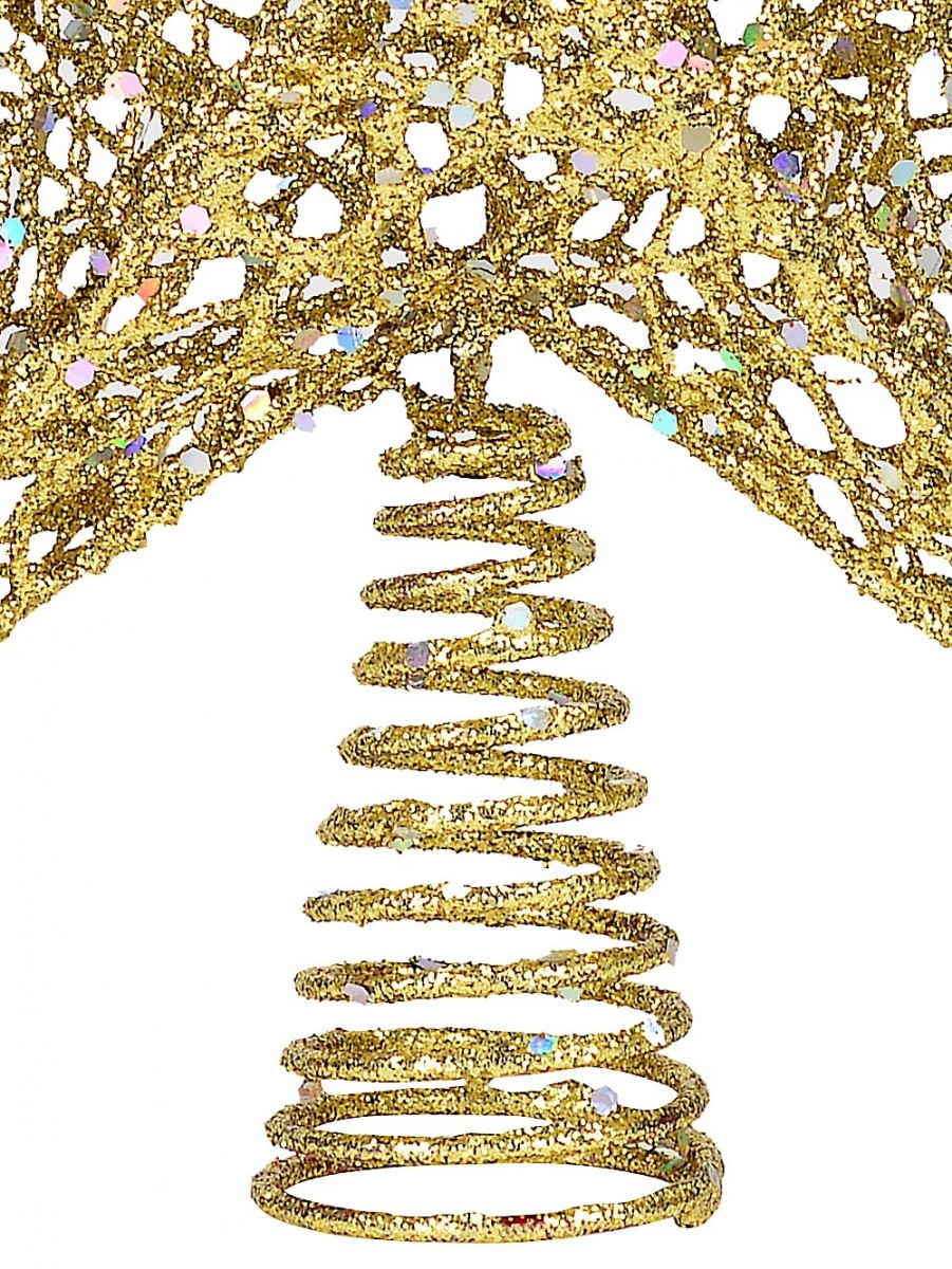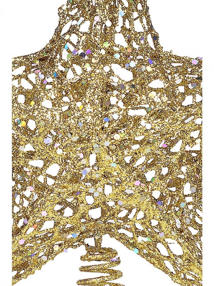 Shaped like a five-pointed star, this gold glitter tree topper is a classic festive accent that looks really pretty yet simple at the same time and fits perfectly on any real or artificial tree. All you have to do is place the bottom spring coil on the top branch or twist the top branches round and through the spiral for a snug fit.