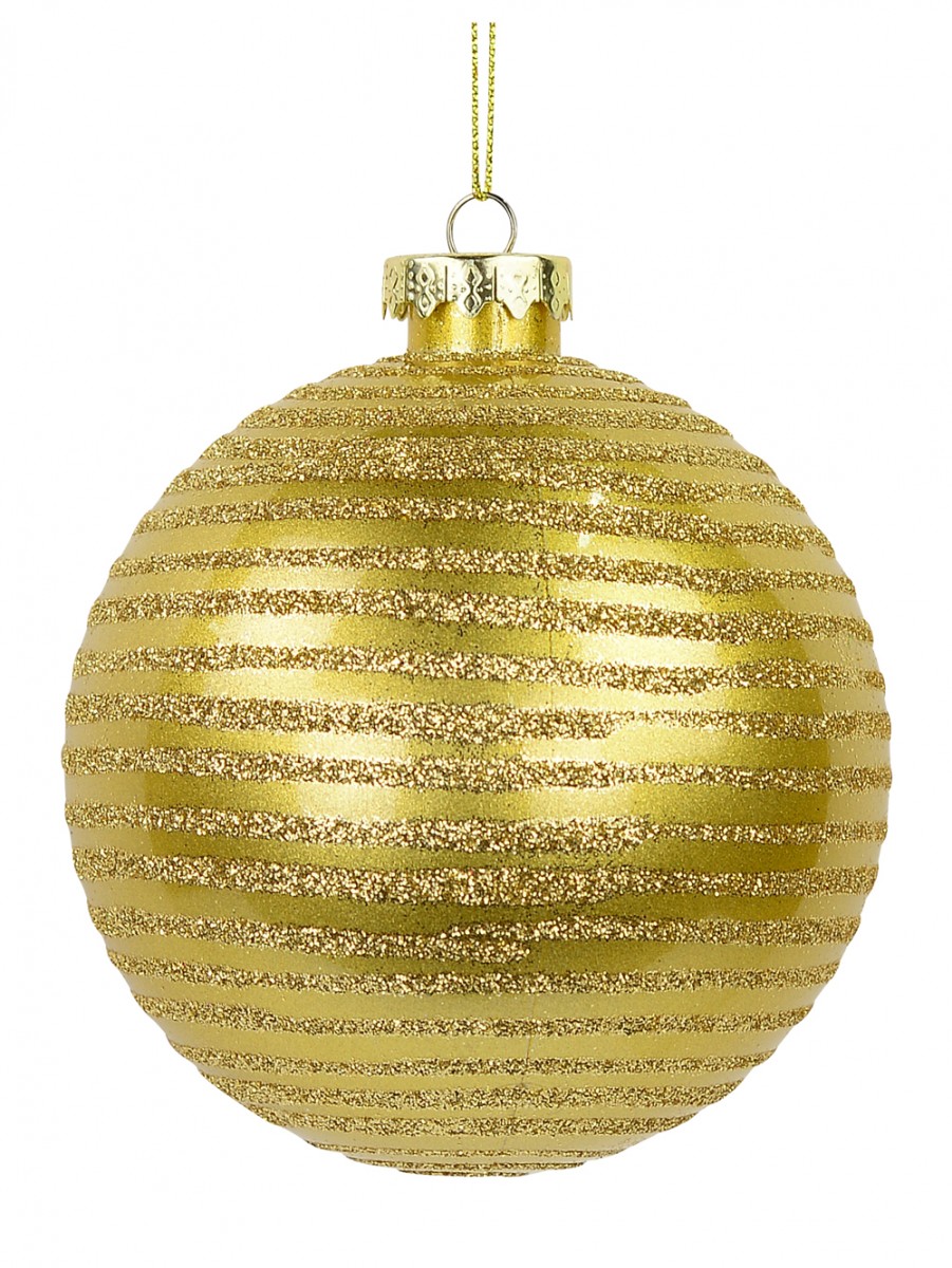 This luxe hanging accessory is 10cm in dimension having multiple striking gold glitter lines drawn horizontally all around its body. It is shimmering and twinkling creating a focal point when hung anywhere in your home, uplifting the mood of any space it adorns. This is designed to dress up any style of tree and accentuate any hallway, wreath, window or door and comes ready to hang with a gold string attached to its metal cap. You can also send it as a holiday gift to someone as it can be shipped around the world.