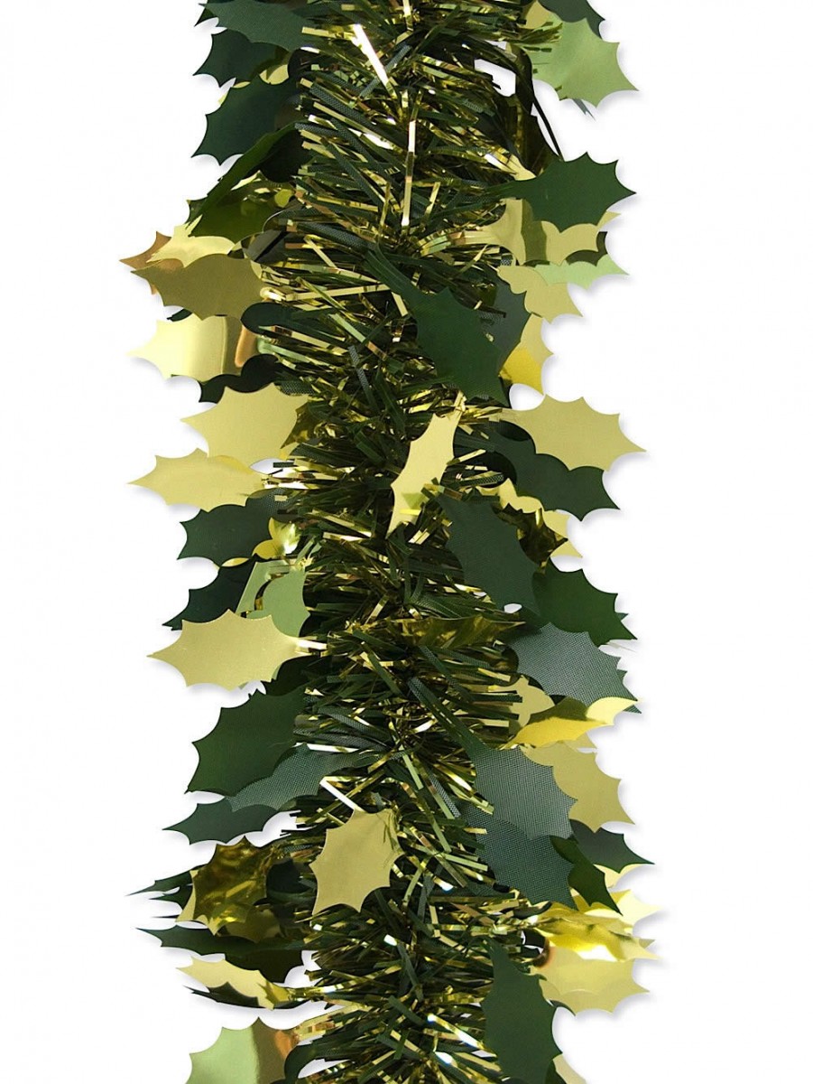 The holly leaves pine and green garland is a unique take on the ordinary strand of tinsel that is inspired by nature but shiny like a Christmas decorationsation. Why deck the halls with plain tinsel like everyone else when these sparkly little holly leaves are so much prettier. The iridescent ropes of green tinsel appear to have a foliage of green holly leaves growing out of the end of each strand. As the light hits each shiny holly leaf and pine needle they reflect back into a different shade of green. The holly leaves pine and green garland would look wonderful wrapped around the edges of rooms and large objects, or draped from the ceiling at regular intervals. Doubling up each individually sold garland with a string of Christmas lights would lend to the twinkly air of the decoration, especially if they were blinking. Perfect for decorating nearly any room indoors or outdoors.