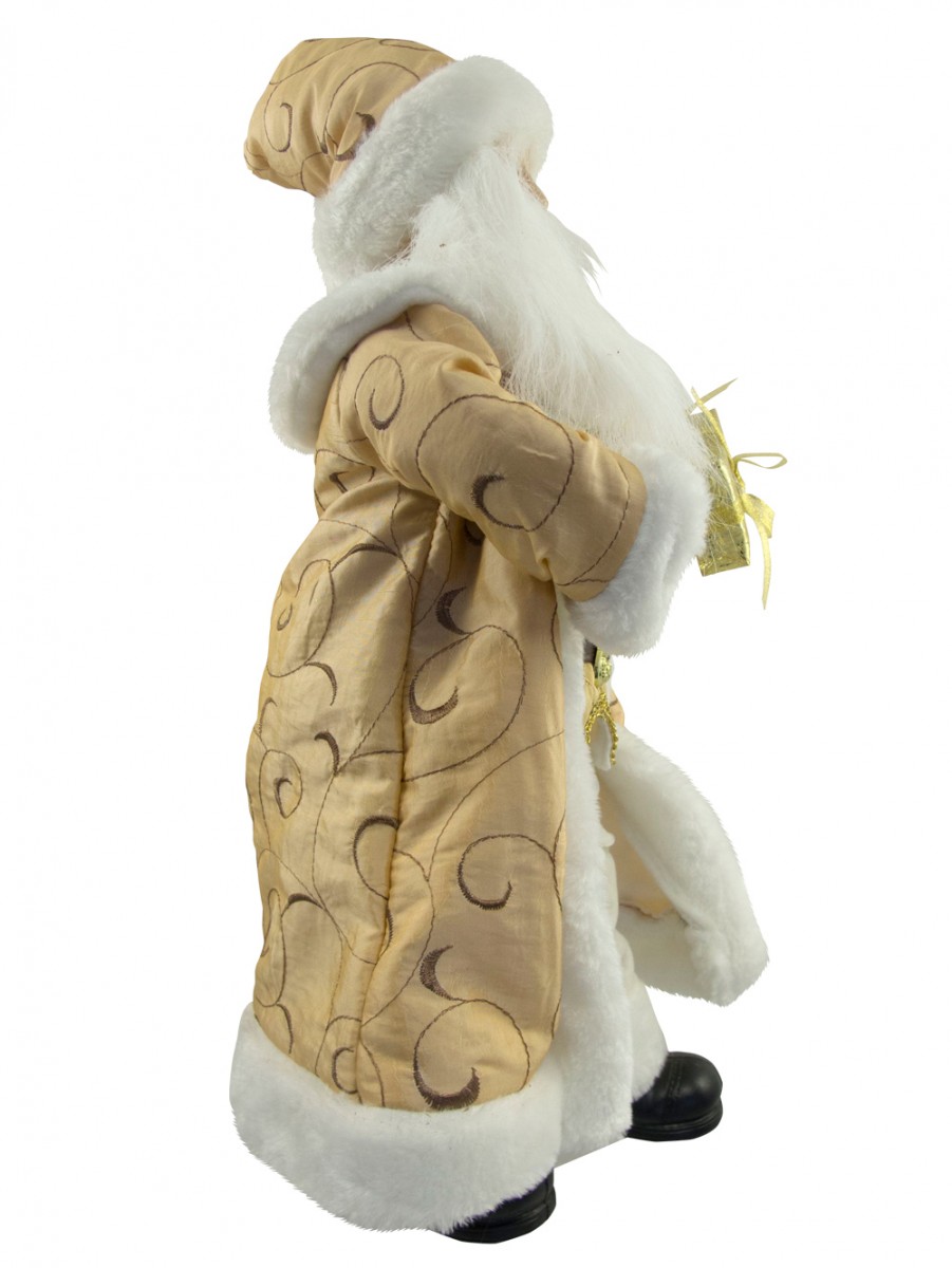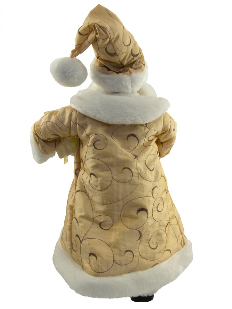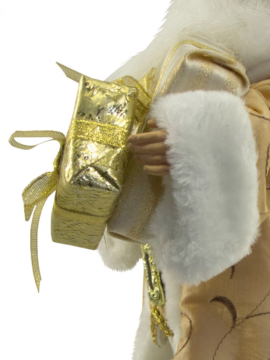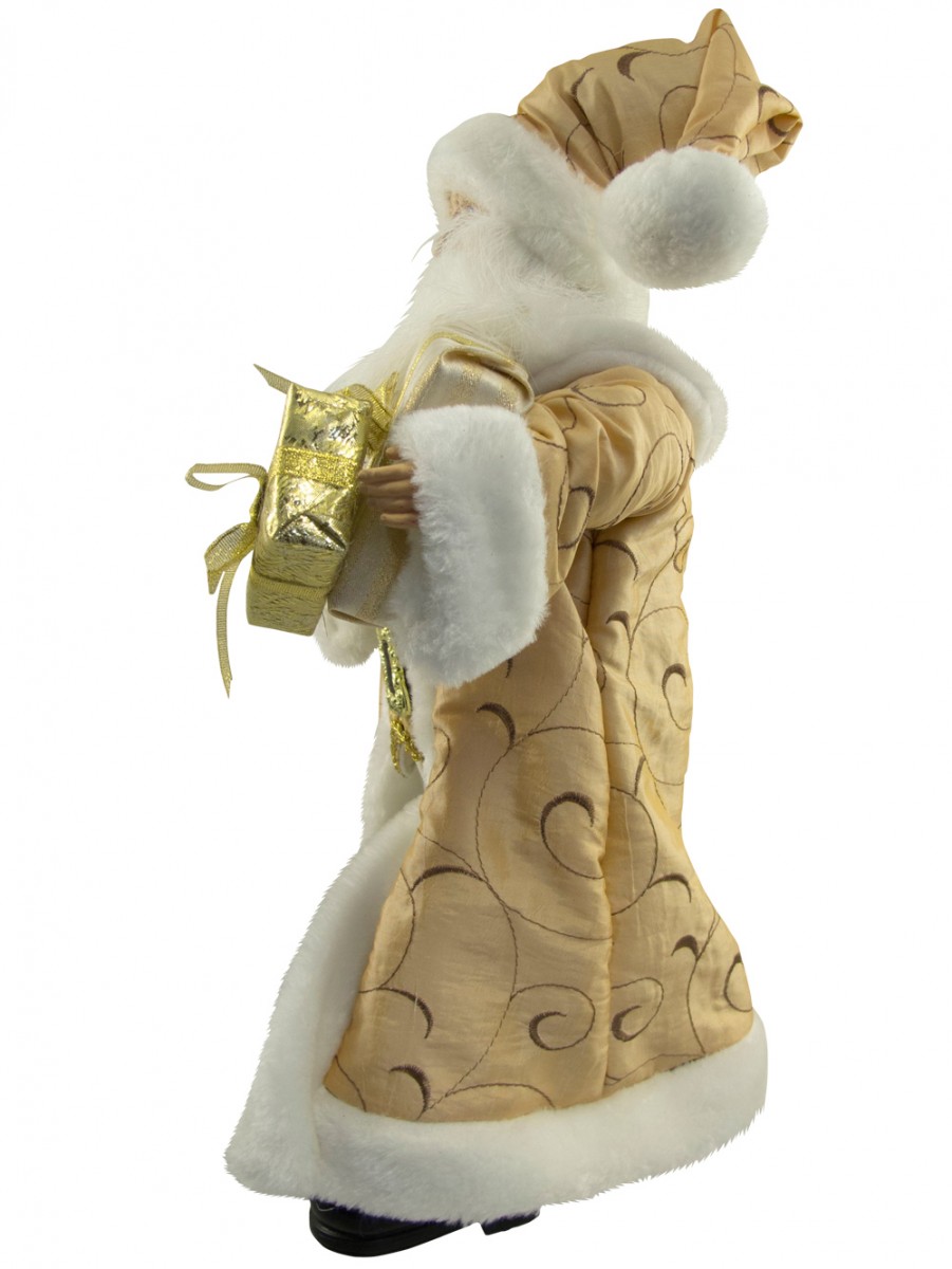 Making the season merrier takes the right Yuletide accessories and decoration to begin with. This Gold & Ivory Suit Standing Decorative Santa With Gifts is a sure head turner for this season. Celebrate the holidays with no less than the all-time favourite symbol of Christmas, Santa Claus. It is a sure stand-out centrepiece or it could blend well with other Yuletide accessories. For seasonal themed presents and gift giving ideas, this ornamental piece is highly recommended. The standing Santa Claus decorative is measured at 55cm tall. it is crafted from the finest and most resilient materials to last many Christmases to come. The plump Santa figure is showcased with the regal gold and ivory robe accentuated with golden deluxe patterns. The robe is matched with the golden inner full length outfit in silky gold. It has curly white beard and the matching gold and white Santa hat. It holds a festive Yuletide gifts in one hand ready to give to that child from the nice list!.
