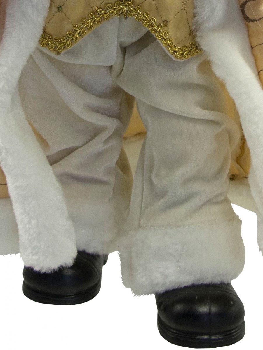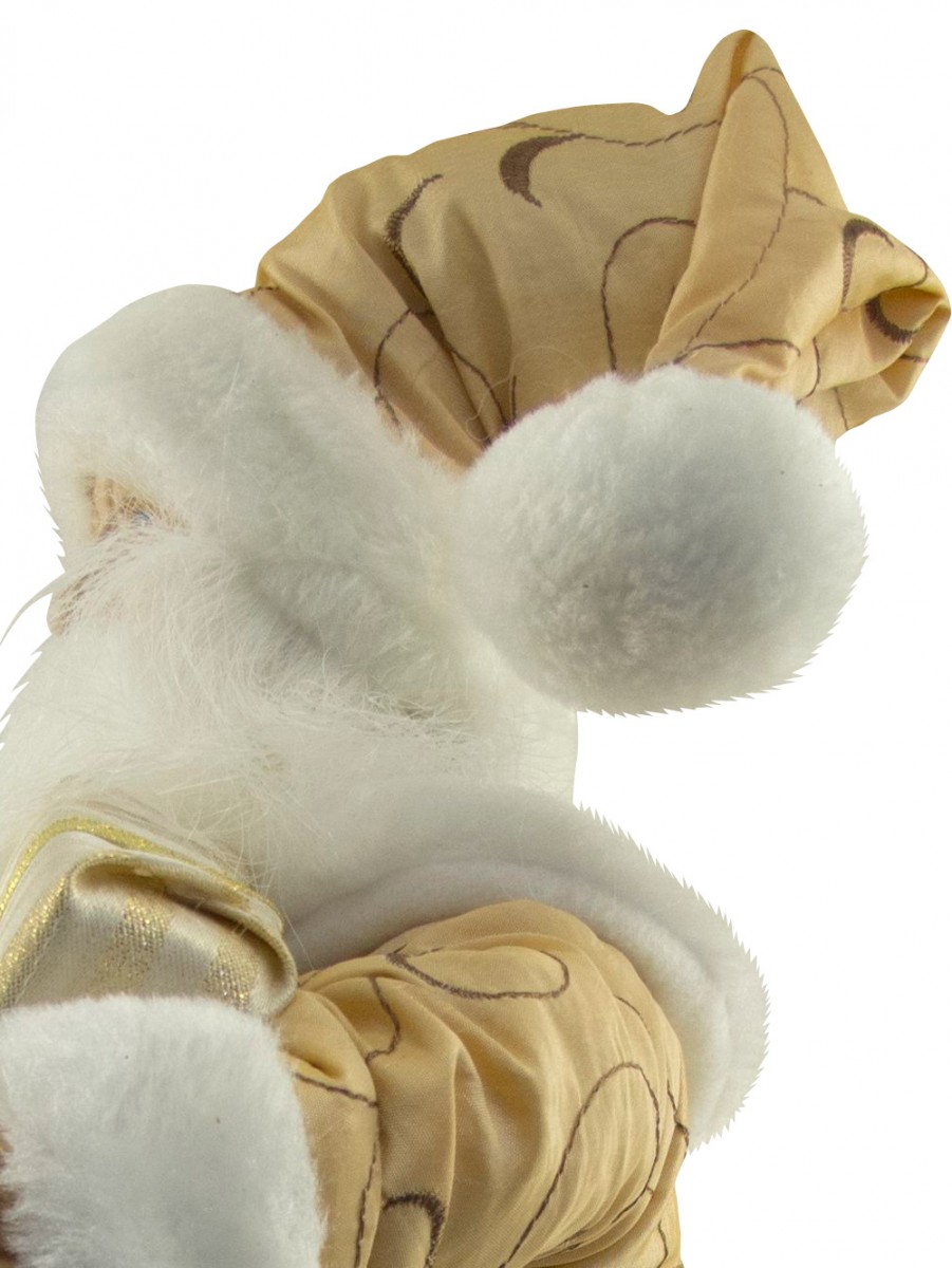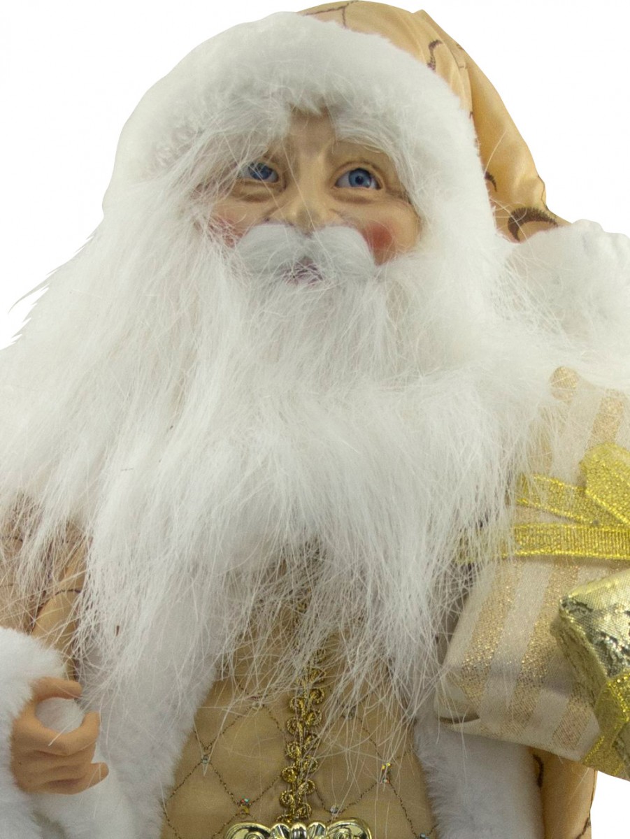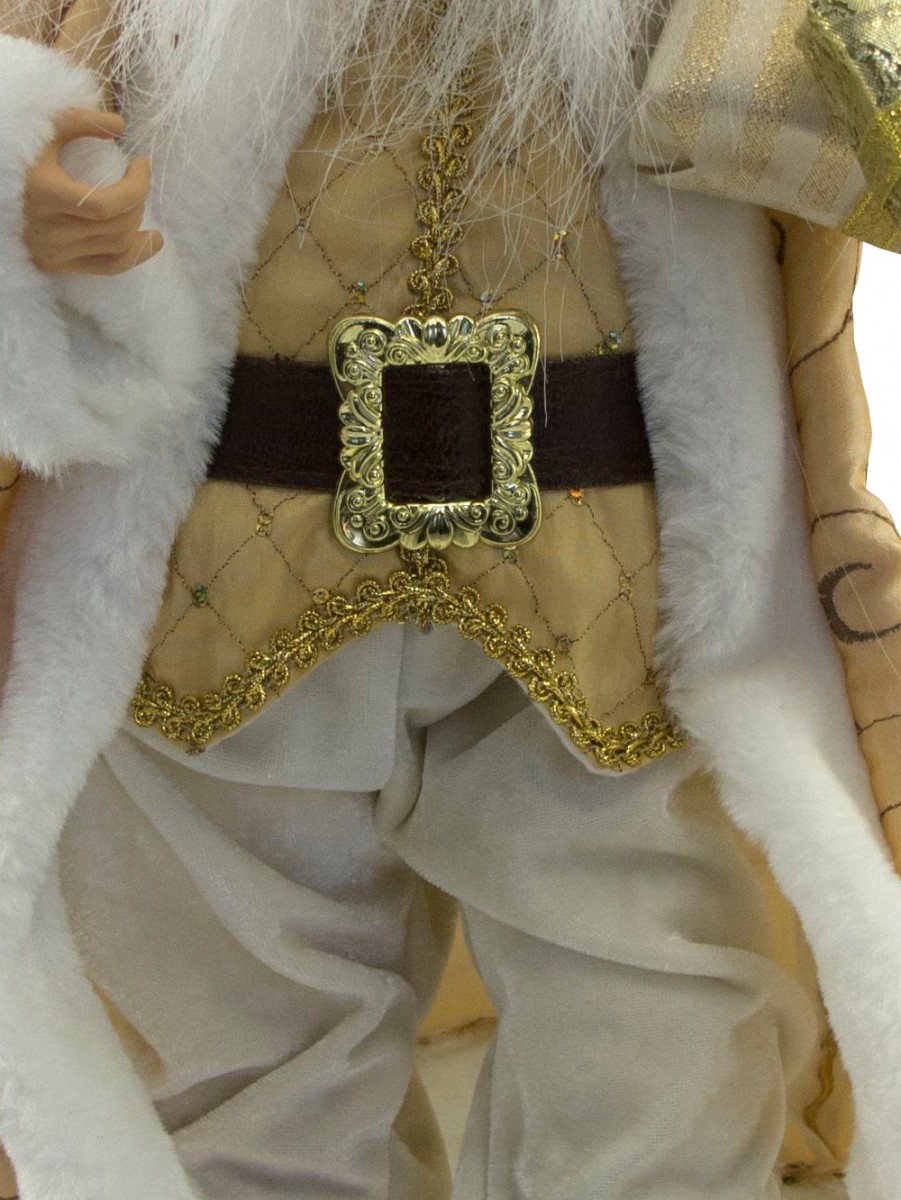 Making the season merrier takes the right Yuletide accessories and decoration to begin with. This Gold & Ivory Suit Standing Decorative Santa With Gifts is a sure head turner for this season. Celebrate the holidays with no less than the all-time favourite symbol of Christmas, Santa Claus. It is a sure stand-out centrepiece or it could blend well with other Yuletide accessories. For seasonal themed presents and gift giving ideas, this ornamental piece is highly recommended. The standing Santa Claus decorative is measured at 55cm tall. it is crafted from the finest and most resilient materials to last many Christmases to come. The plump Santa figure is showcased with the regal gold and ivory robe accentuated with golden deluxe patterns. The robe is matched with the golden inner full length outfit in silky gold. It has curly white beard and the matching gold and white Santa hat. It holds a festive Yuletide gifts in one hand ready to give to that child from the nice list!.