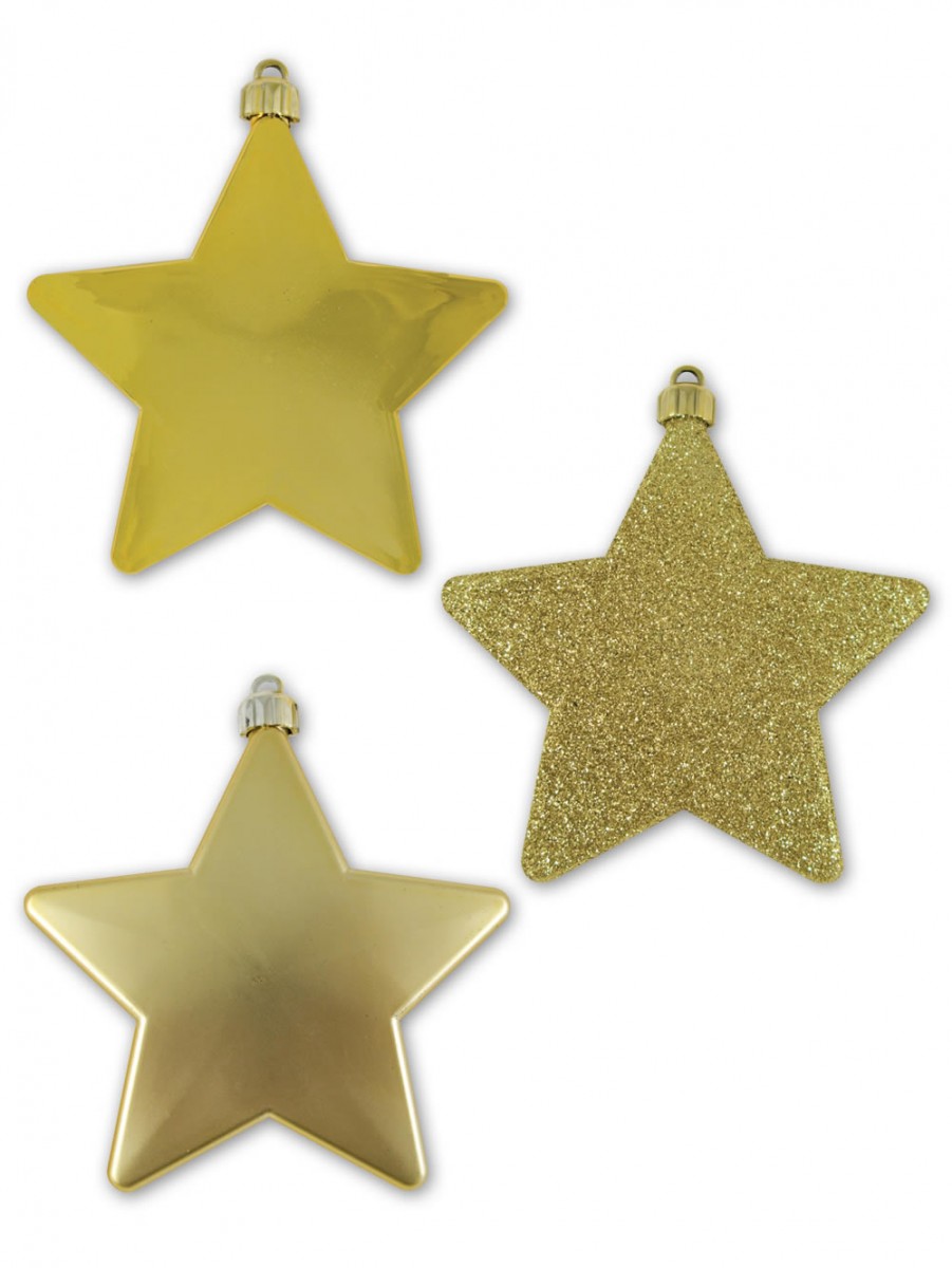 At the Christmas Warehouse we stock packs of five gold three-dimensional stars to add some gold sparkle to your tree or other display. Each pack contains 1 glitter, 2 matt and 2 metallic stars, all 95mm in height and length and 15mm deep, with a gold plastic cap at the top so they can be hung from the ceiling to create a glittery star display. They can even be placed at intervals on your Christmas tree. You could, if you wish, buy several packs and have a variety of gold stars all through your 'Christmas room', or even hang some in the kids' bedrooms to delight them on Christmas morning!