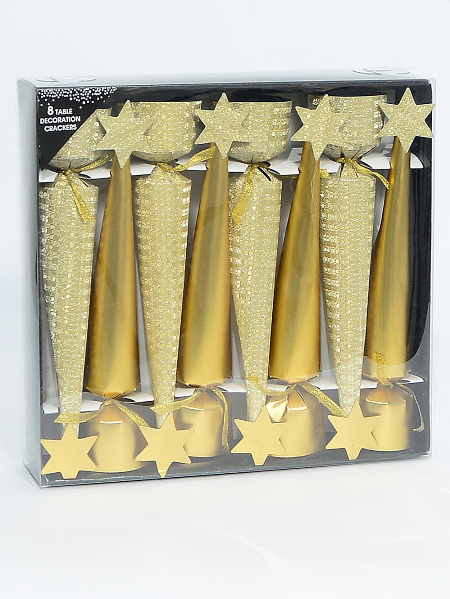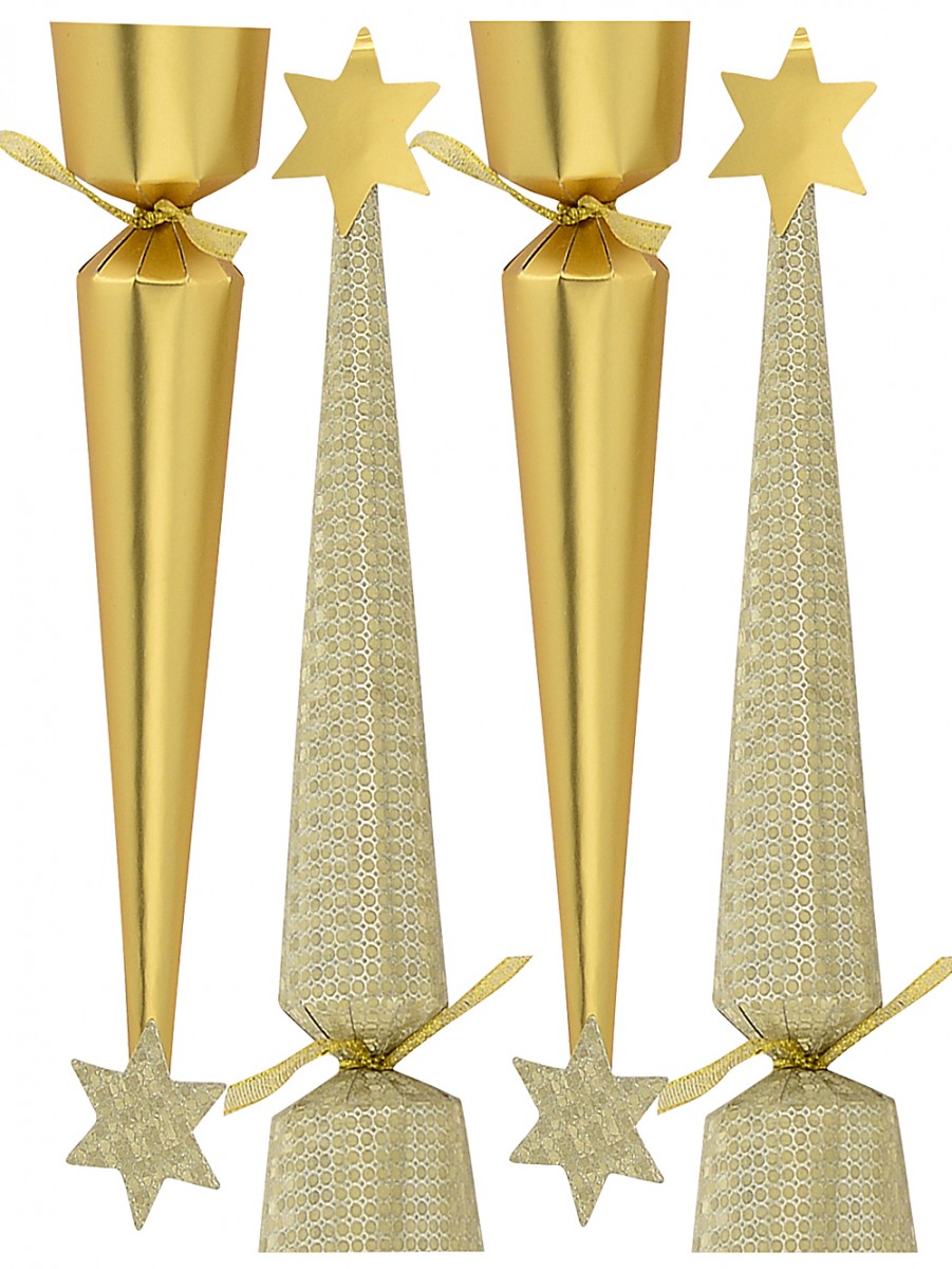 This pack of eight Gold Matte & Shiny Circle Pattern Christmas Tree Crackers showcases two similarly designed but differently ornamented bon bons. All eight bon bons are made and shaped in an alluring conical shape and have their contents sealed with the use of gold coloured strips. The first four bon bons feature a shiny gold hue while the other four showcases a more reserved colour decorated with dots. At the end of each bon bon is the Christmas motif of a star.