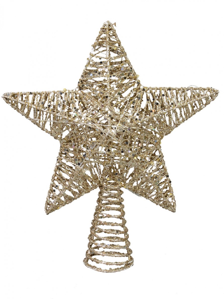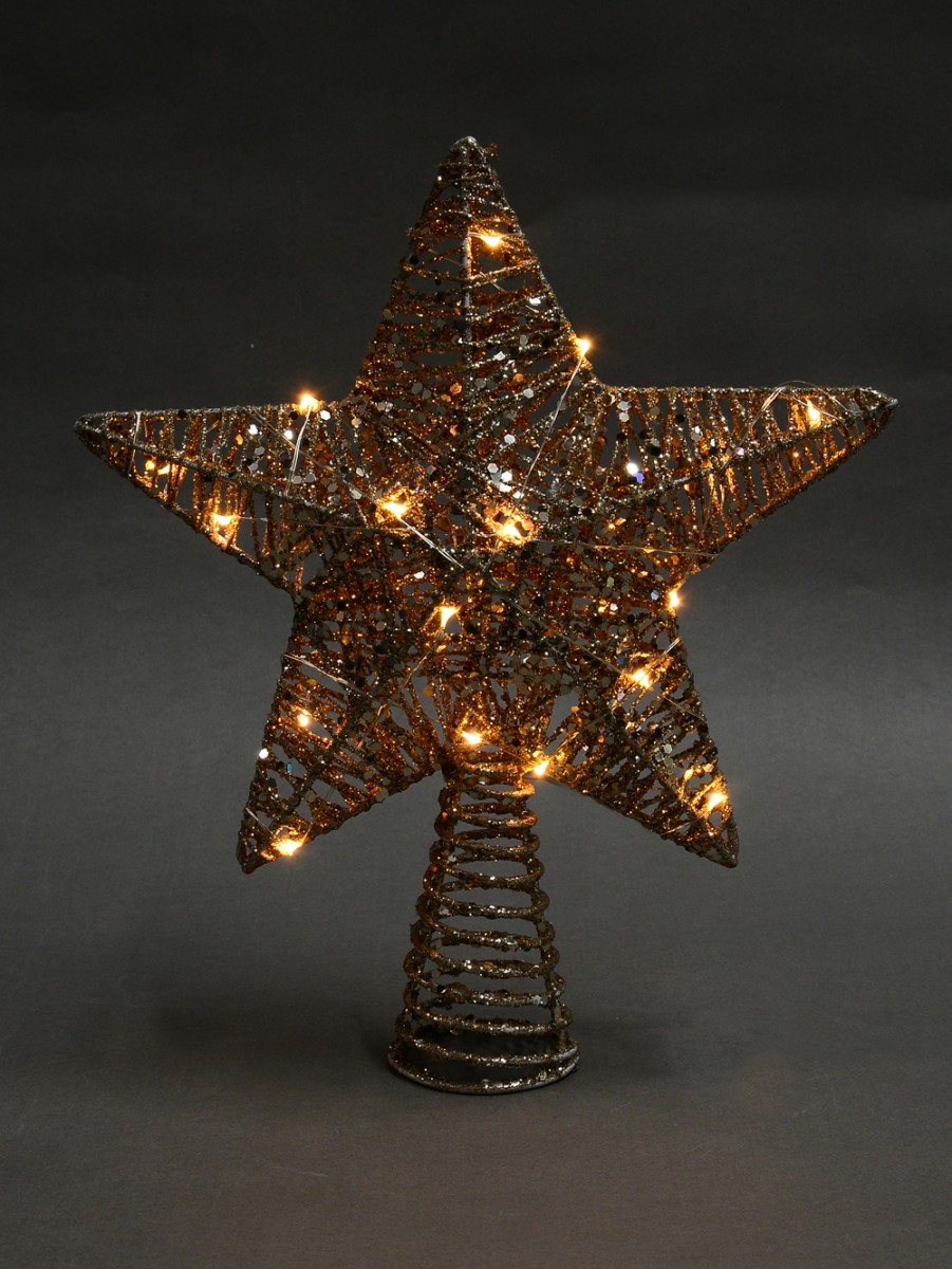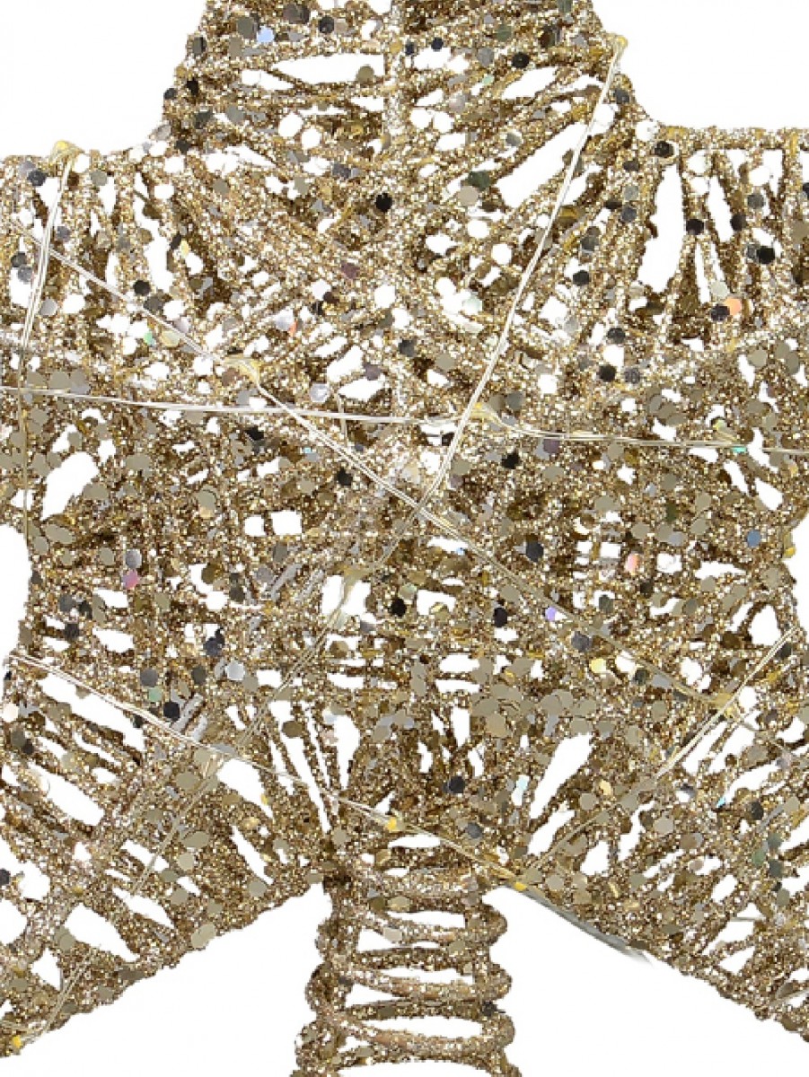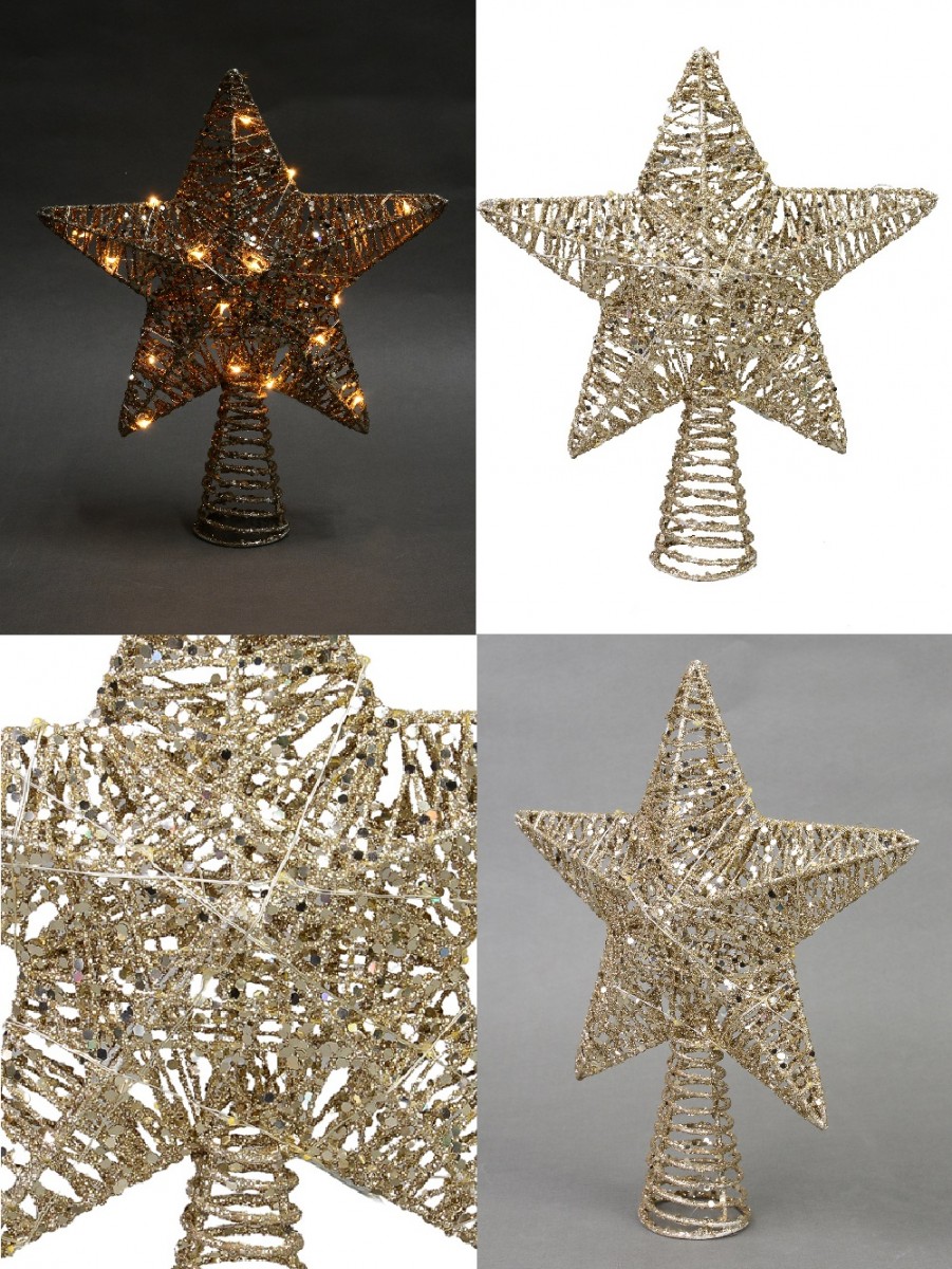 With a matching gold glittered, durable spiral base, it can be easily mounted on top of any real or artificial tree making it a lovely holiday addition for displaying year after year. This 3D tree topper will look right at home among your traditional decor, or even as part of a more contemporary theme and the soft glow of the LED light will add to the shine of the glitter and the sequins. You can even attach your angel to this topper to give her some shine and create a wonderful display!