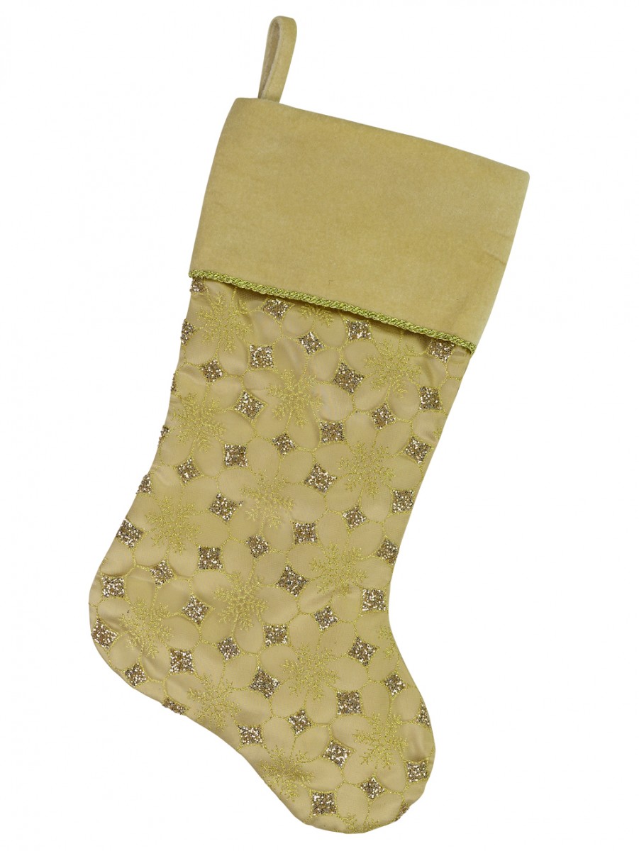 Stocking features a gold glitter star & snowflake print with a gold cord trim