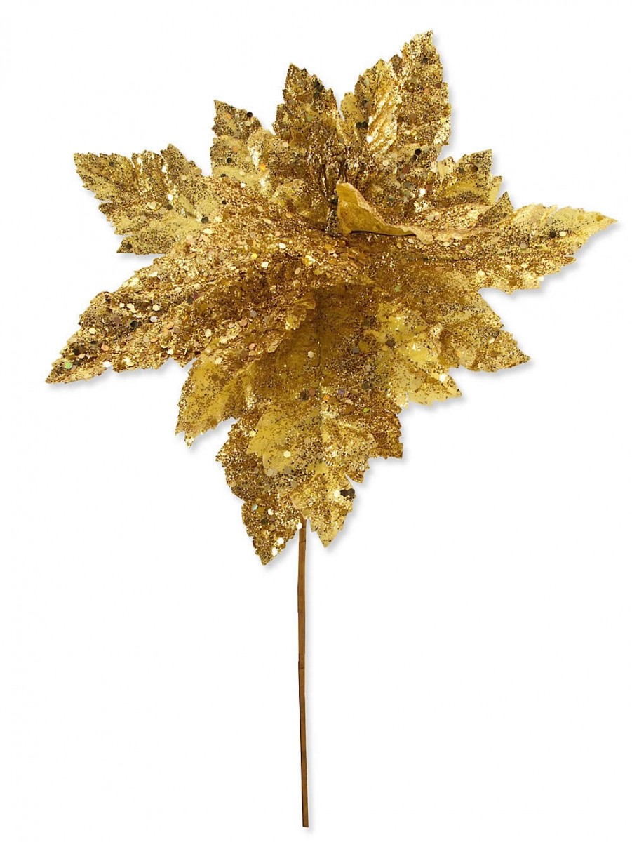 Adding metallic accents to a natural palate is a fantastic and glamorous way to jazz up any Christmas arrangement. This dazzling gold poinsettia pick is one such accent. Bedecked in sprinkled glitter and glass beads, the poinsettia catches the light for a metallic sheen and sparkling brilliance. Measuring 45cm by 20cm, this stunningly large display can be used with other pieces, or standing alone in a low vase. The hand wrapped stem can be easily wrapped with other stems in a display. The golden poinsettias could also be used to decorate a large wreath for a brilliant metallic sheen. While this gold and sparkling version of the classic flower, poinsettias have been part of the Christmas tradition since a story arose in 16th century Mexico. The poinsettia flowers sprung from a gift of gathered plants and resemble the star that shone brightly in the sky to lead the shepherds and wise men to the stable. Poinsettias are now a rich part of the Christmas tradition and these beautifully crafted golden poinsettias are sure to wow all of your guests. The fine detail of this flower make it must-have for any classy decoration scheme. Be sure to check out similar offerings from the Christmas Warehouse so your display can shine brilliantly through the season.