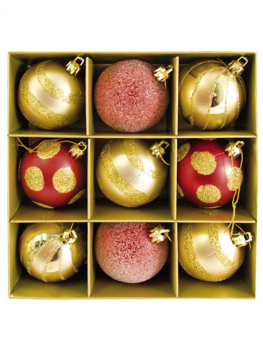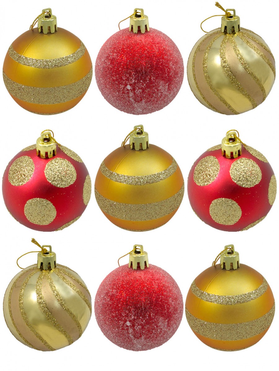 Red and gold are the unofficial colours of Christmas! The yuletide season is definitely made even much jollier and celebratory with decorative Christmas balls. There is variety and diversity especially with Baubles - Gold & Red With Assorted Patterns - 9 x 60mm. This box containing nine pieces of chic and eye catching baubles is sure to enhance the holiday aesthetics. It is ideal for different venues and places such as homes, offices and others. It instantly accentuates Christmas trees and other corners of the venue to decorate. Nine Christmas baubles are made from light weight and quality materials. It has 60mm diameter for size. What make this lot an amazing ornamental piece to invest on are the versatile and chic designs. Five lovely balls have gold palette with matching hand painted deluxe glitter patterns. The remaining four baubles in deep and fiery red color have matte, metallic and glittering finish. All balls have cap with matching gold cord.