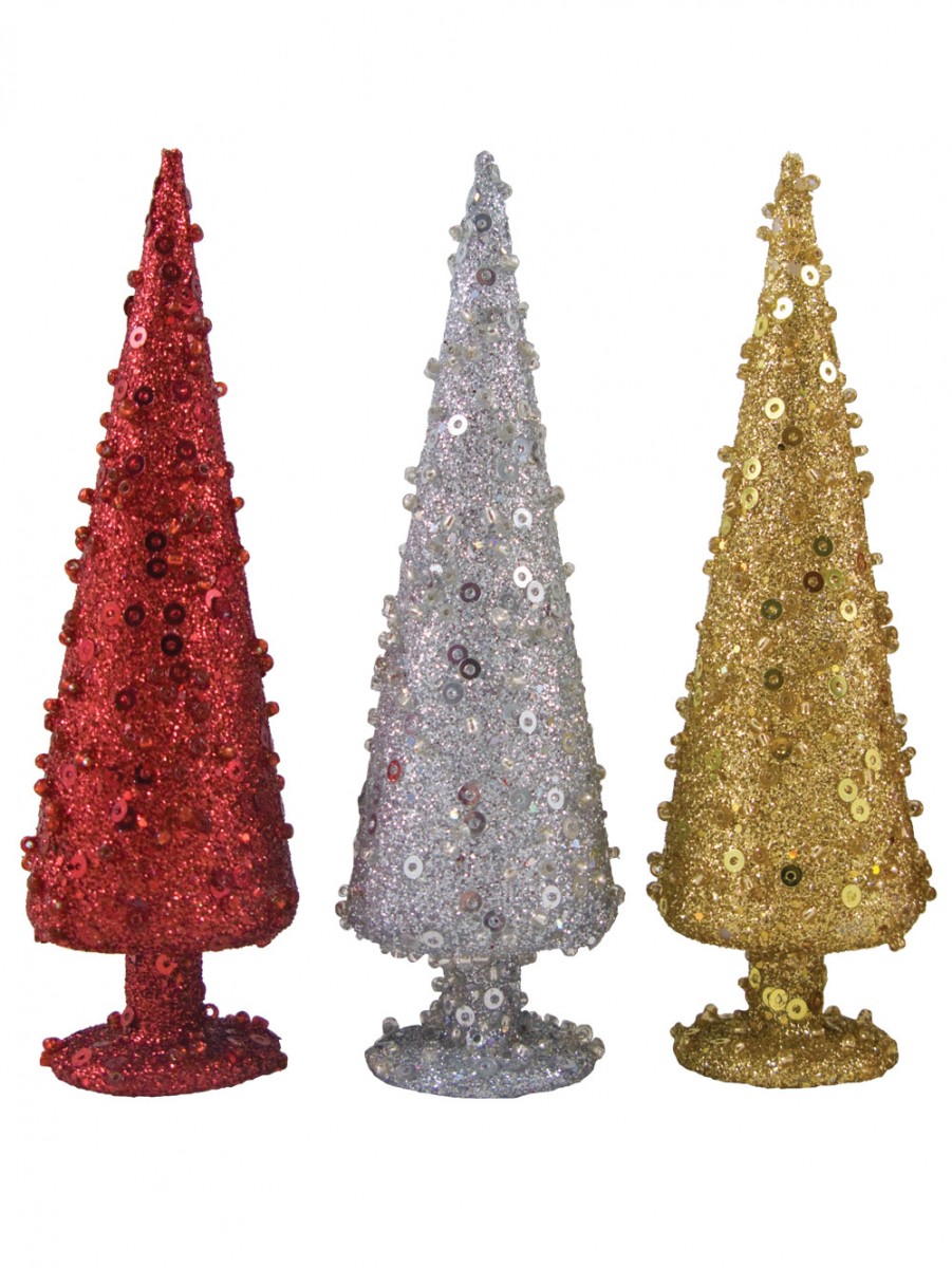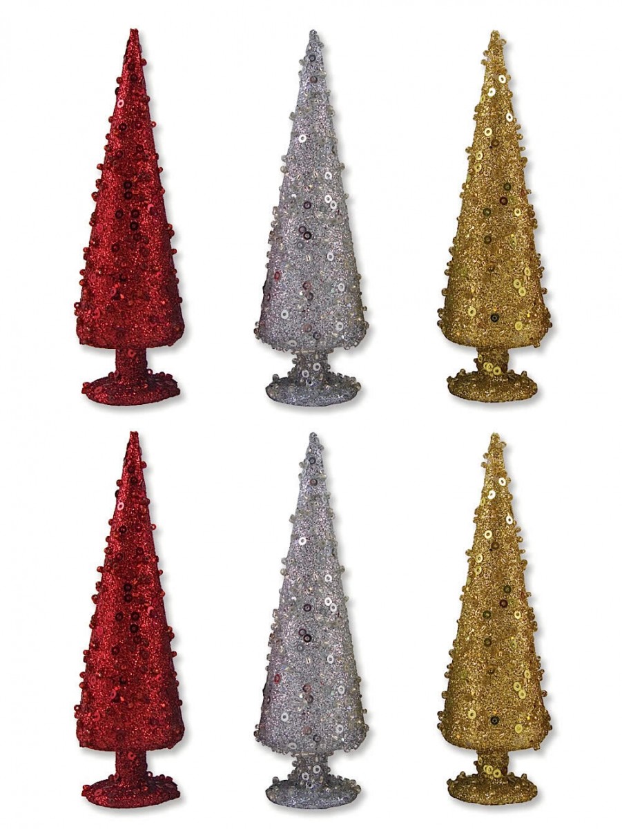 A set of six, there are two trees in each colour: red, silver and gold. At only 13cm high, these adorable trees are a great accent decoration. You could place them on a shelf for added holiday cheer where your guests least expect it, nestle them amongst your holiday village pieces as metallic accents or use them with in a display on your dining table to impress your guests with your fashionable taste. Christmas trees truly help to emit the Christmas spirit with their sense of wonder. Create your own forest of beautiful Christmas trees. The tasteful metallic colours add a sleek and modern feel to these traditional symbols of Christmas. Bring your holiday party to life with shiny design elements. Placing lights near metallic items will cause the twinkling lights to reflect off of the shiny surface and create a beautiful spectacle of lights. Adding silver and gold and shimmering red immediately adds an element of elegance to any holiday display. Keep your style refined with these trees on display. Consider placing bowls of metallic ornaments around the room, with the focal point on the metallic tree forest. However you use them, neither you nor your guests will be disappointed.