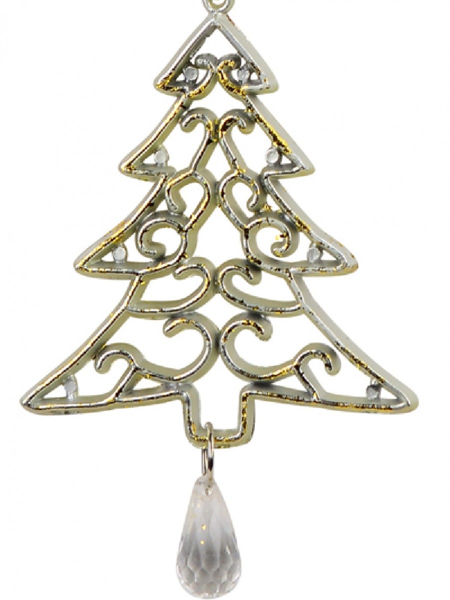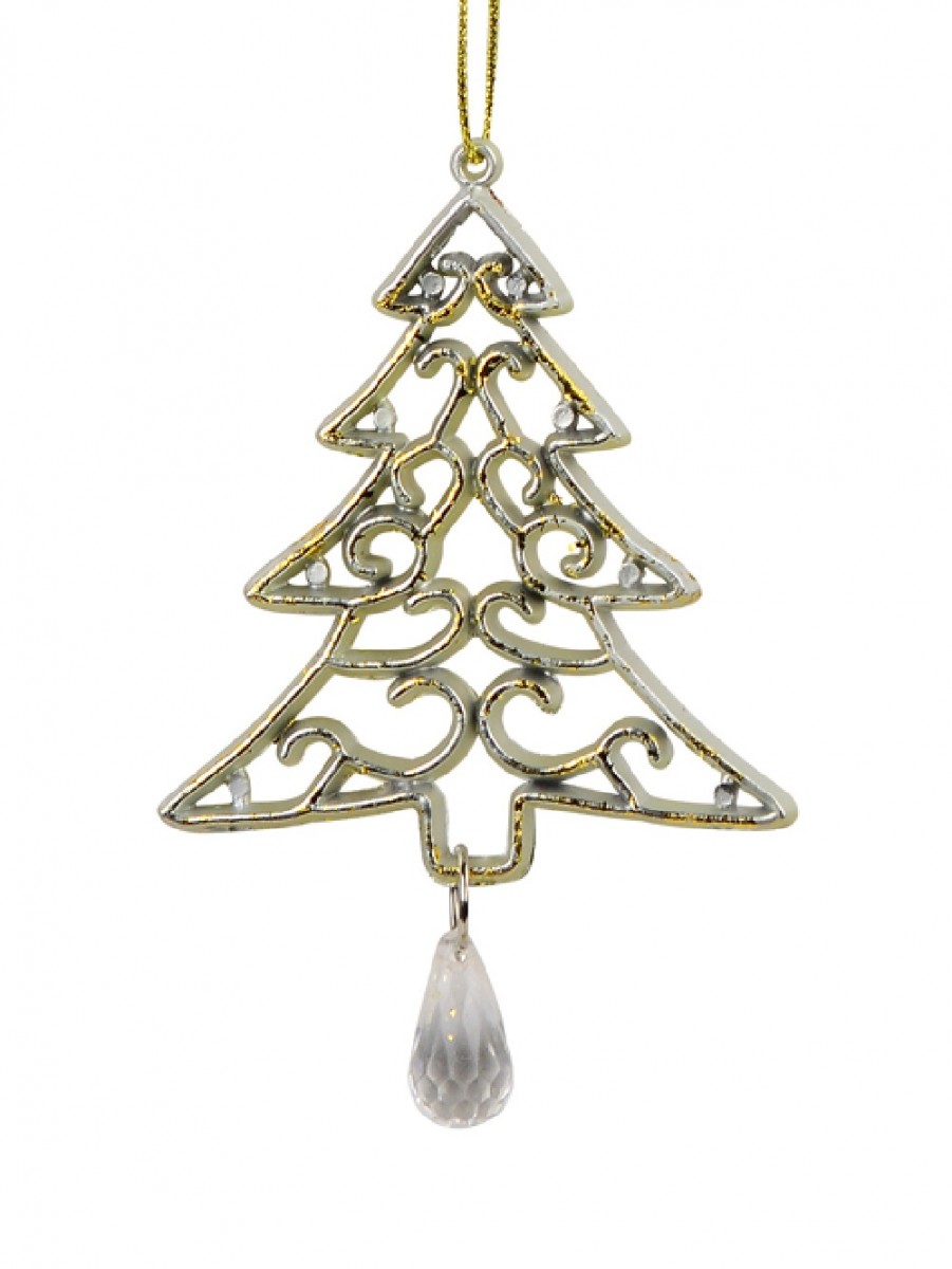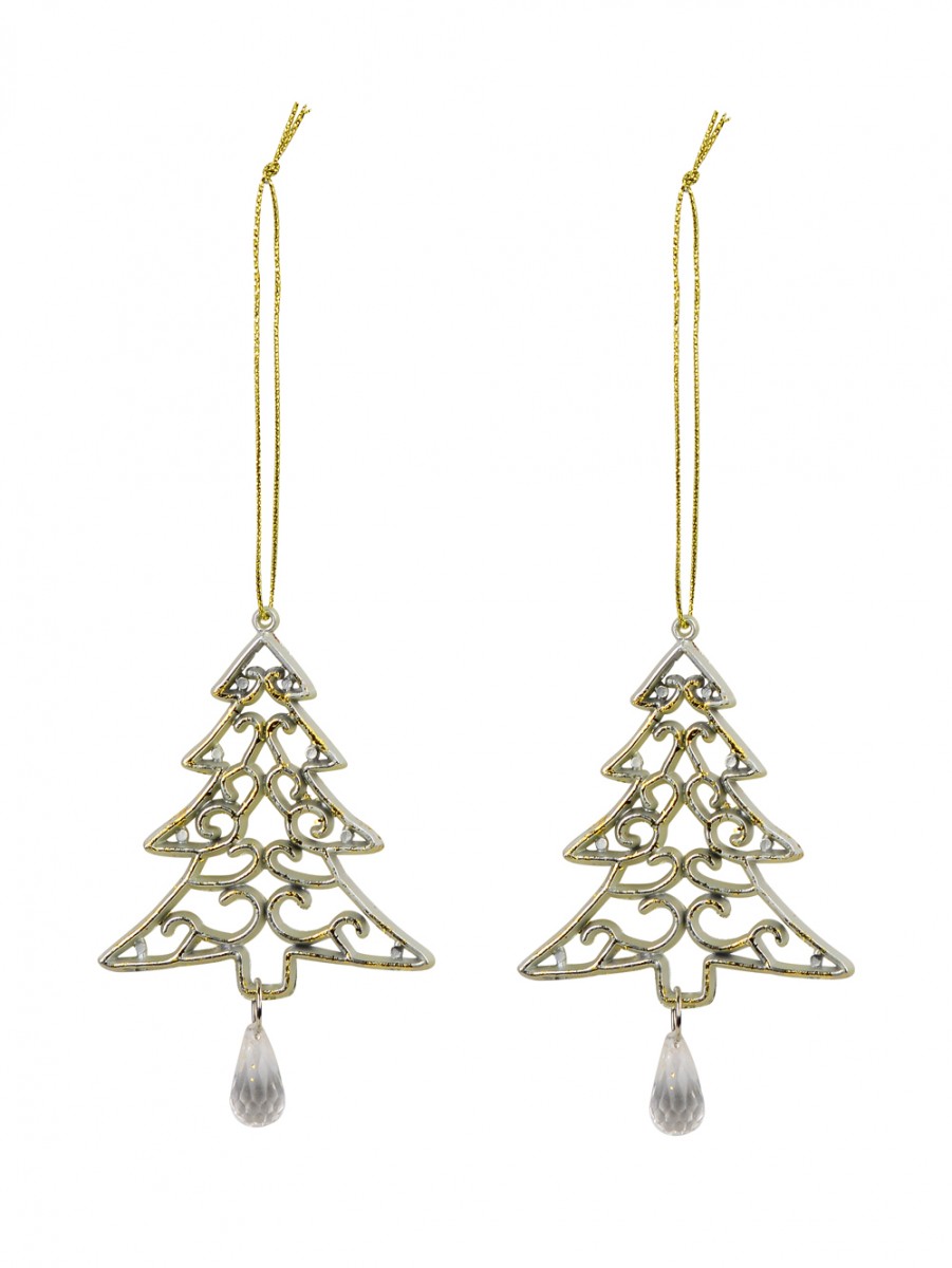 Fresh with silvery-white trimmings just like flocked trees, these gold Christmas tree shaped ornaments are here to help you get your place ready for the holidays! Each piece borrows its silhouette from the Christmas tree with intricate gold swirl designs inside each tree, dotted silver accents, and a hanging white drop shaped gem for a wintry touch.