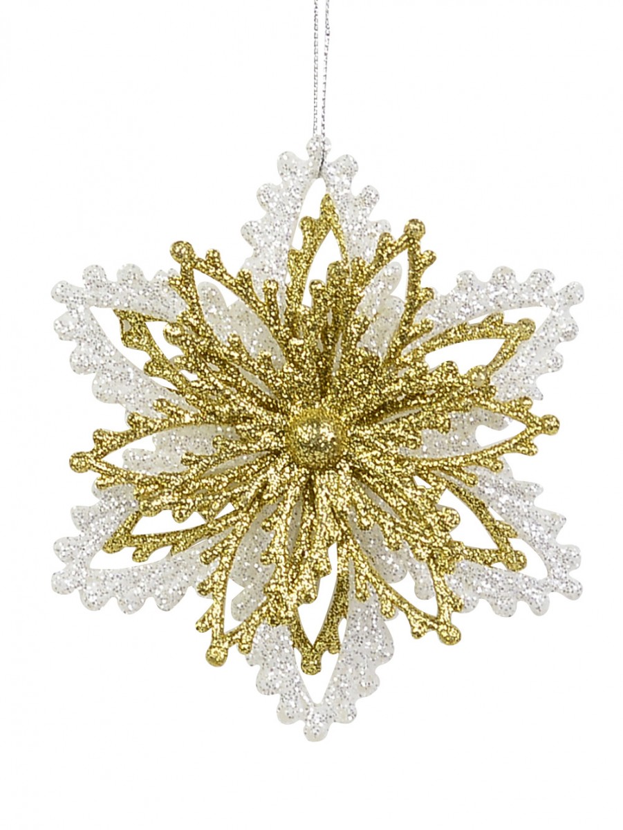 Create an abiding impression of your Xmas tree with this enticing Gold and White Snowflakes Hanging Ornament that will bring the Christmas spirit to your home. This double snowflake hanging ornament is 13cm x 13cm x 13m in dimension and has a small gold glittered snowflake with a gold ball in the middle attached to a bigger white glitter layered snowflake.