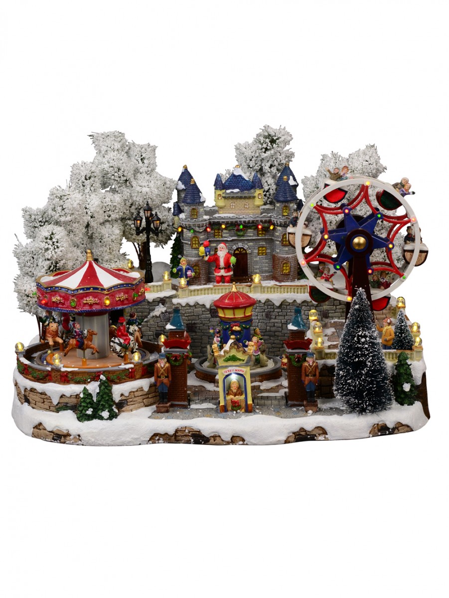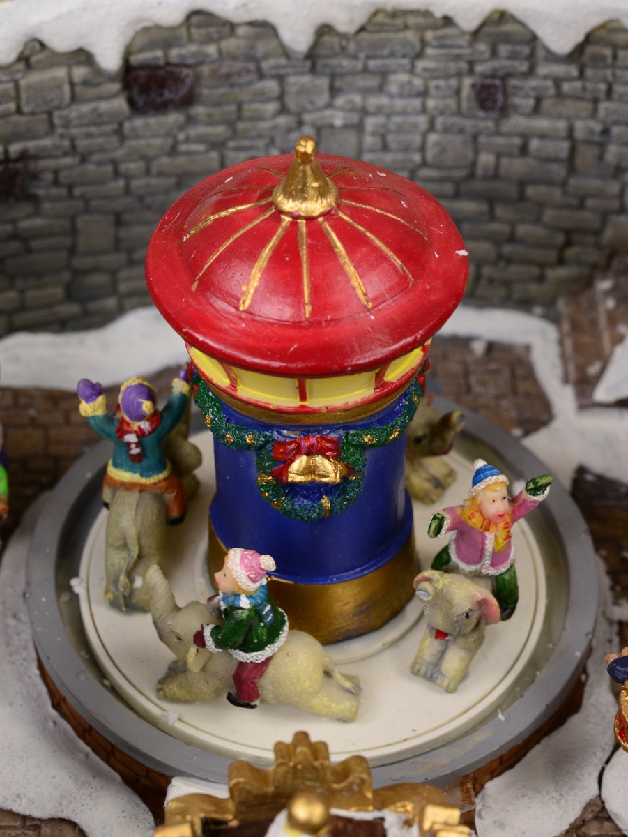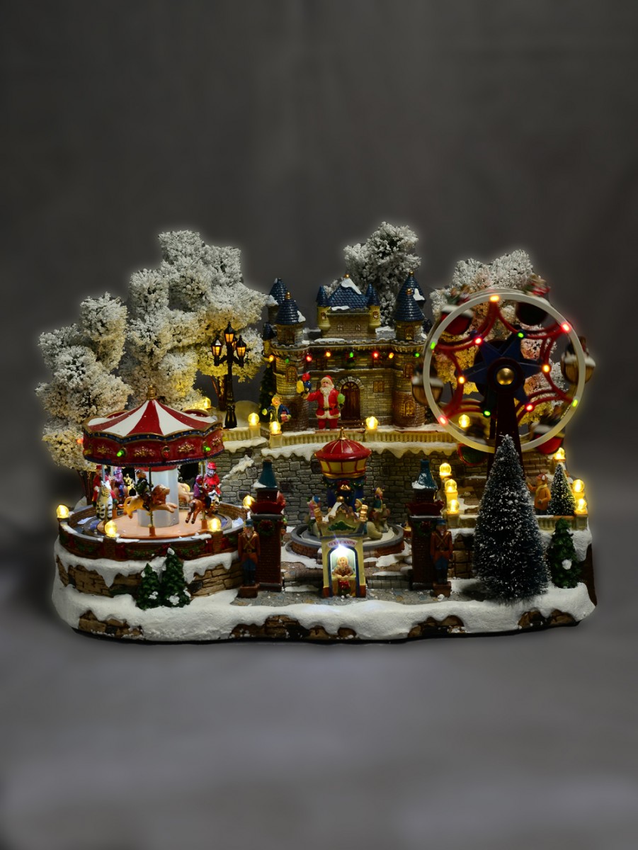The Illuminated, Animated & Musical Grand Christmas Winter Fun Park Scene is a decor enhancing Christmas themed animation which showcases a fun park covered in patches of snowfall. Santa is seen standing in front of the main building beside a boy while Santa holds balloons in his hands and the boy carries a gift pack in his hand. Several other children are seen having fun in various locations around the park. As is expected, the animated fun park is ornamented in Christmas colours of red, gold, white and green in combination with other alluring colours. This savvy Christmas colours assortment is why this ornament would blend in perfectly with your Christmas decor.