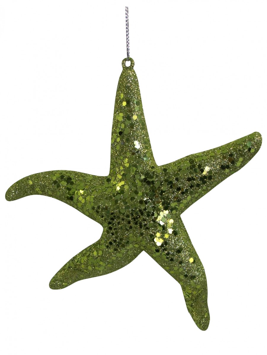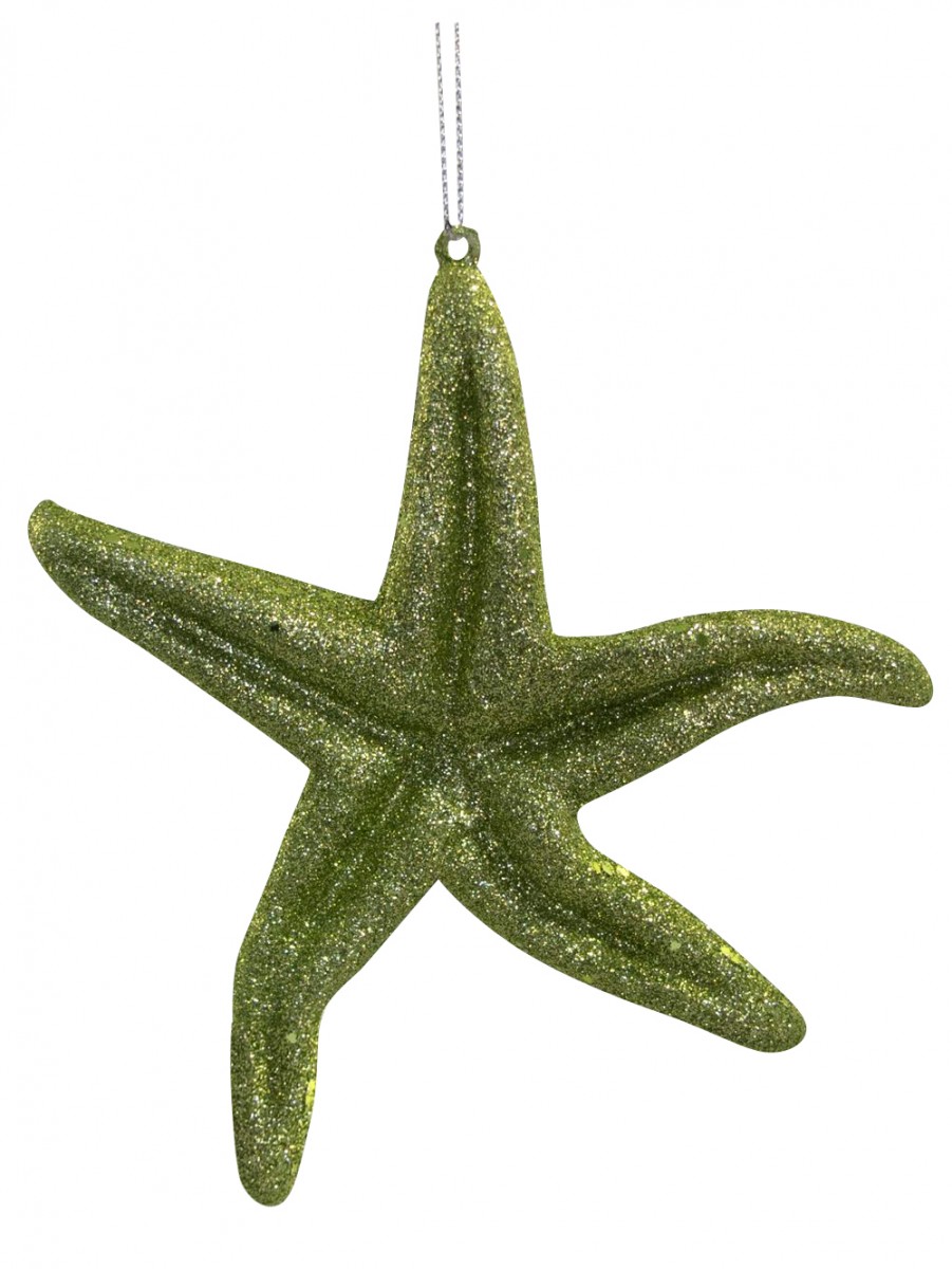 A modern green hanging starfish ornament for the Christmas season. The starfish is finished with a green shimmery glitter and is 14 cm wide, 14 cm long and 20mm deep. Featuring five points, they are made to look not straight to get a starfish affect rather than resembling a Christmas star. The ornament comes with a silver string in order to hang it on the Christmas tree. The product is to be hung on the Christmas tree and is sold individually. This green, glittery, hanging, Christmas tree ornament can be shipped worldwide. In addition to this it is guaranteed to be low price and has a 100% replacement guaranteed stamp.