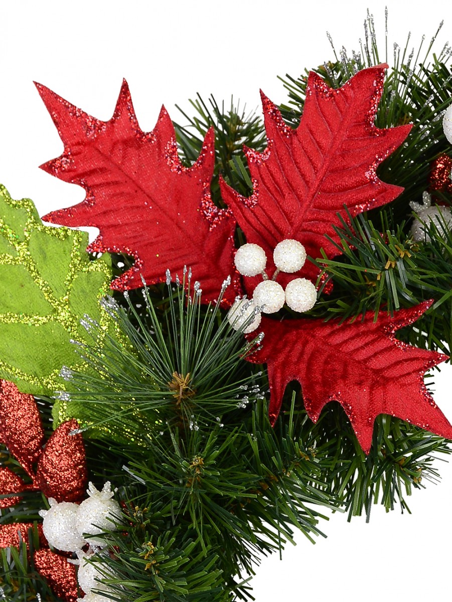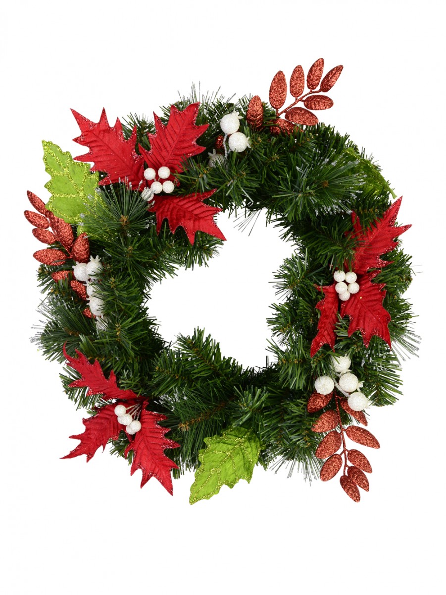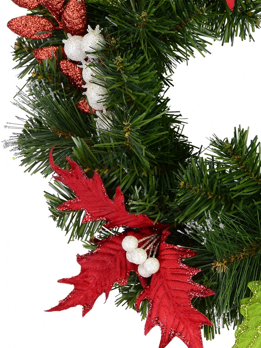 this wreath will find a warm place in the hearts of kids and those who are kids at hearts. It comes pre-decorated on its dark green tone with red and green leaves and white berries that from afar, could be mistaken for immaculate white eggs.