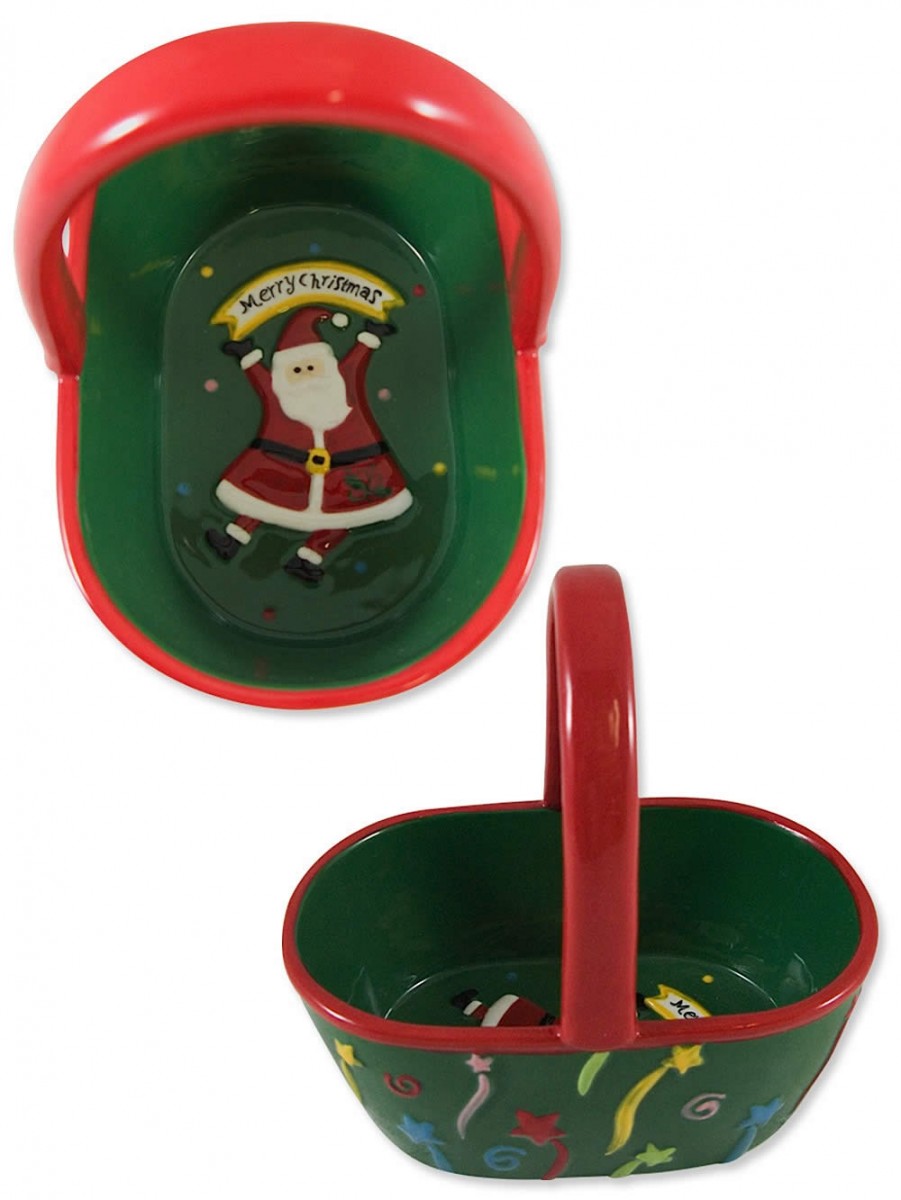 Are you tired of the usual and boring bottles and jars for your Christmas treats? The it's time to put them in the shelves and instead, place those treats and candies here in this charming Christmas Dining - Ceramic Green Basket for Holding Gifts or Treats - 140mm. The item is made of ceramic material, and comes in a smooth and shiny finish, nice to the sight and touch. The basket is of a dark green colour, while the handle is of bright red. The basket is designed with stars and swirling lines and a variety of shapes, all of which are very colourful and vibrant. The lines and shapes and the colours all mix together to form a wonderfully lively piece. On the inside is a picture of Santa Claus holding a "merry Christmas" sign, cheerfully greeting whoever dips his or her hand into the bowl. This is surely one Christmas tableware that will delight all of your guests with a sweet tooth.