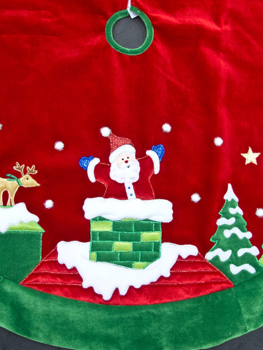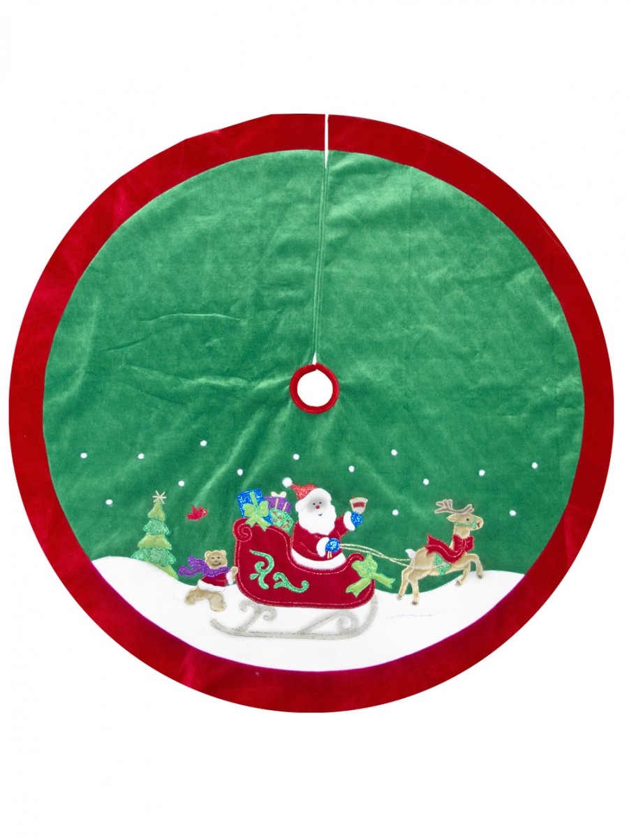 The tree skirt is almost as important to finishing the look of the Christmas tree as the star is at the very top. Although it's covered by presents on Christmas morning, the tree skirt is what pulls the entire look of the tree together until that much anticipated day. Considering its importance, it must be full of style and pizazz. This Green Velvet Tree Skirt provides you with all of that and then some. The green tree skirt has a wide red border on the outside and a thin one at its center. At the front of the tree skirt, Santa is depicted in his sleigh going over a snowy landscape with a bag full of toys in tow for good boys and girls while his trusty reindeer is ready to take off in flight. It's a scene that will undoubtedly make you smile. Need decorations to finish off the rest of your Christmas tree? Christmas Warehouse has all you need from the tree topper to the strands of lights.