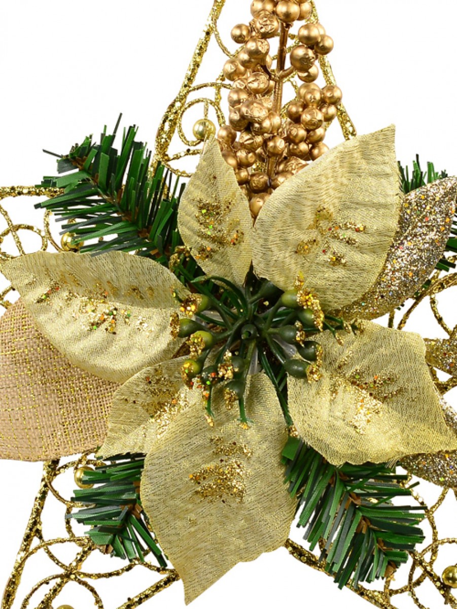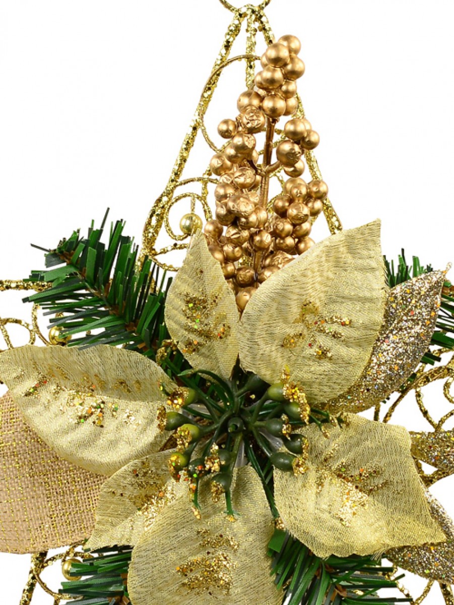 With a bedazzling design, the Gold 3D Metal Wire Star Hanging Decoration With Poinsettia is the perfect Christmas tree ornament consisting of sequinned star background, pine twigs, gold coloured miniature baubles, and an assortment of glittered, bespangled velvet fabric flower petals in the shape of a beautiful poinsettia flower. It even comes with a complementary gold coloured thread.