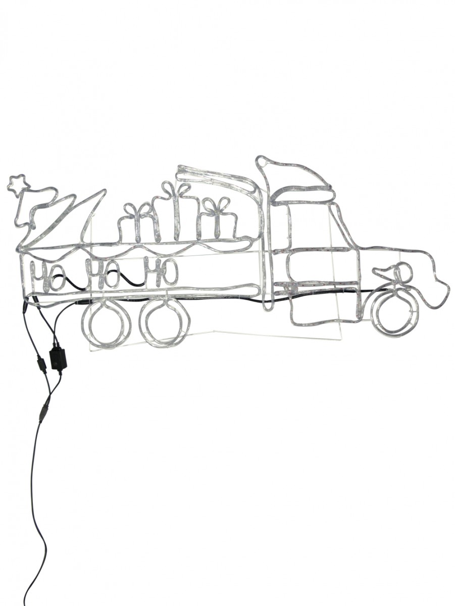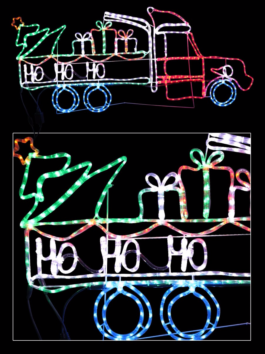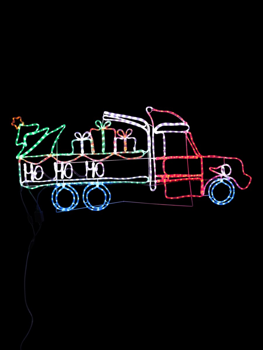 Spread some Christmas cheer this year by lighting up your neighbourhood with fun and style! This bright and multi coloured LED light display depicts a Christmas truck with tree and gifts packed in the pack, and Ho Ho Ho graphic. Clear tube robe encloses the LED bulbs for a streamlined look. This lighting display includes a multi speed flashing function, including static mode. This lighting display measures 1.8 m x 75 cm and includes an extra 3 m of lead wire. Suitable for both indoor and outdoor use. This product is mains operate and complies with all Australian safety and performance requirements.