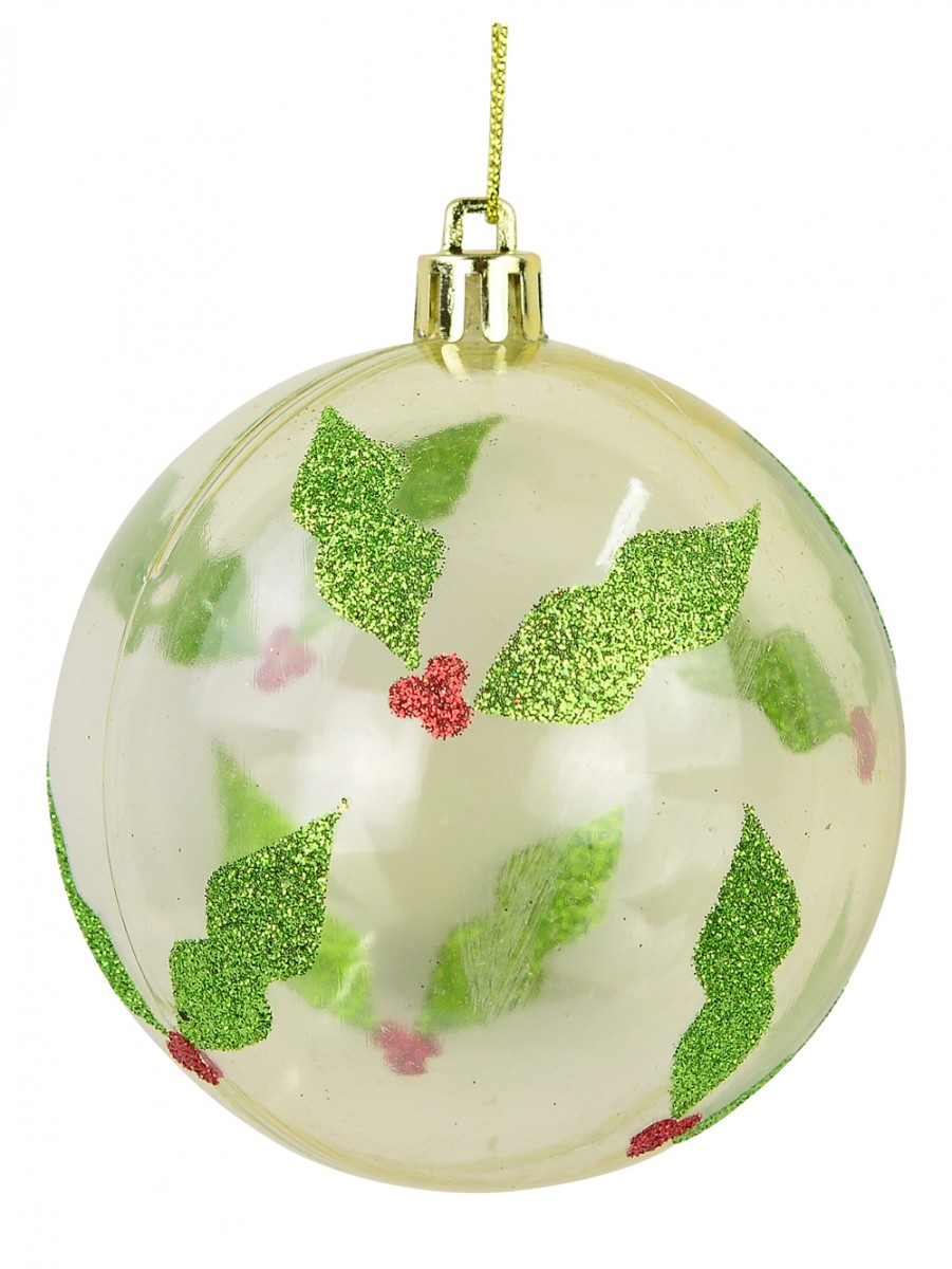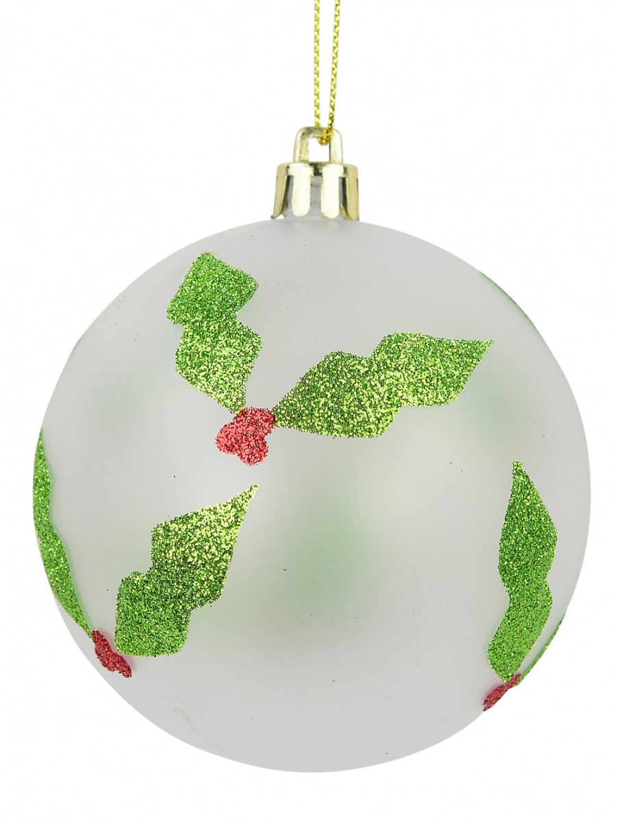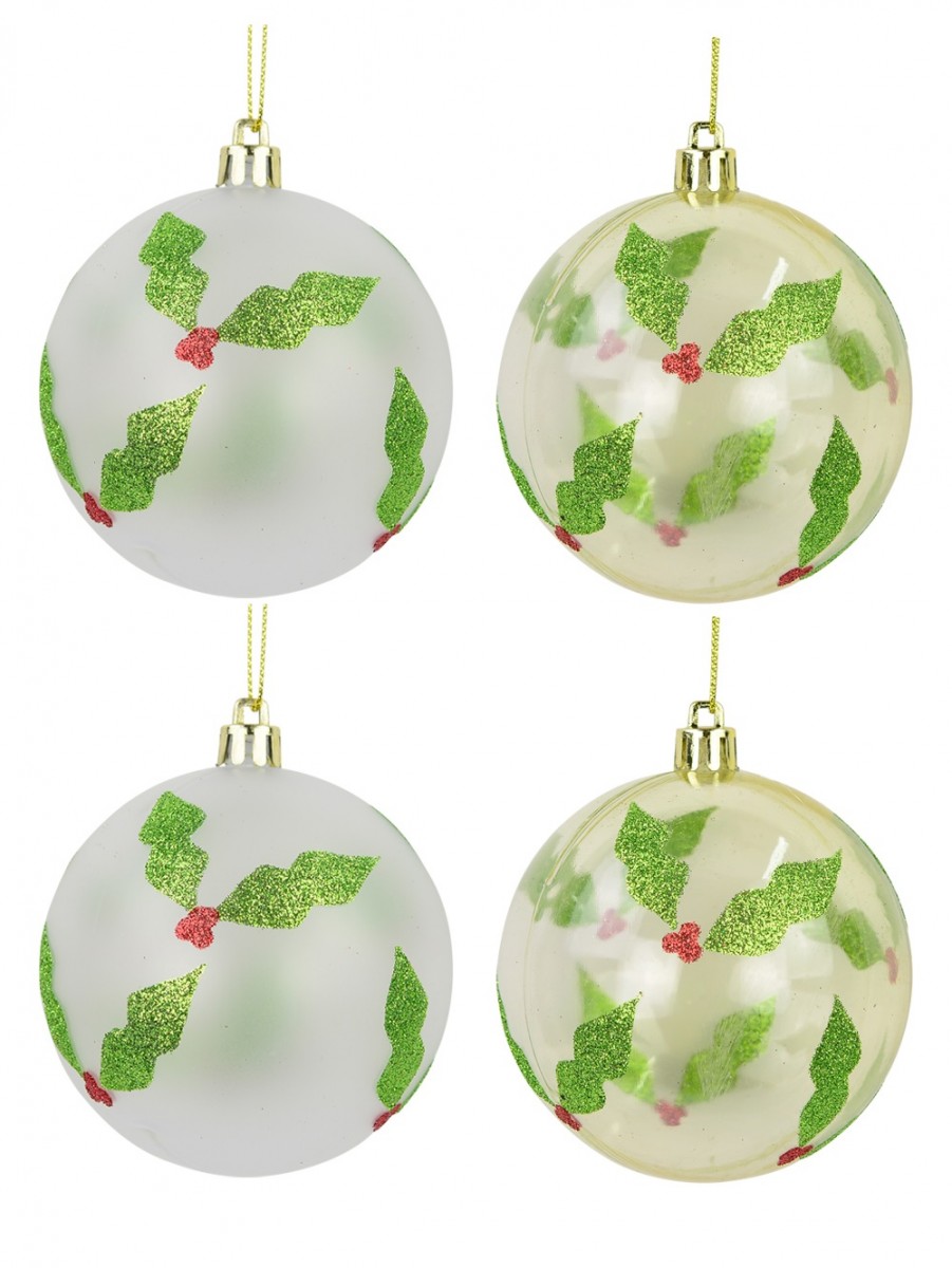 With a delicate holly print in red and green glitter, this pretty pack of four baubles will definitely stand out from the rest of your Xmas tree ornaments and it will be a welcome festive addition that will fill the atmosphere with holiday cheer! Featuring two translucent white baubles and two clear soft gold baubles, both having red and green glitter holly print; they are 6cm in dimension and ship worldwide.