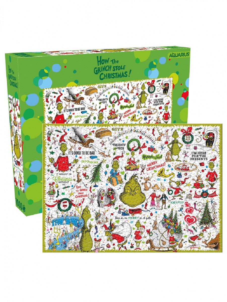 How The Grinch Stole Christmas Collage Jigsaw Puzzle will not only entertain you and your family this holiday season, it comes in handy as a table or mantle decoration after it has been assembled. Challenge your brain with a jigsaw and put your creativity to the test by exploring how many different images and font expressions within the collage you can find. The best part is its colourful images that will bring kids much more fun and happiness. This jigsaw puzzle is the ideal birthday gift. Also, it is the perfect stocking filler or pre-Christmas entertainment for kids.