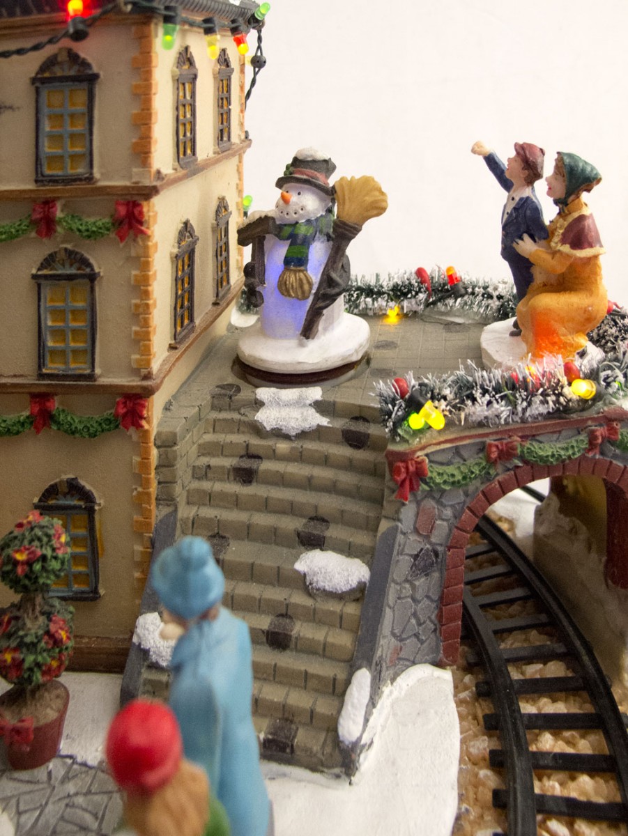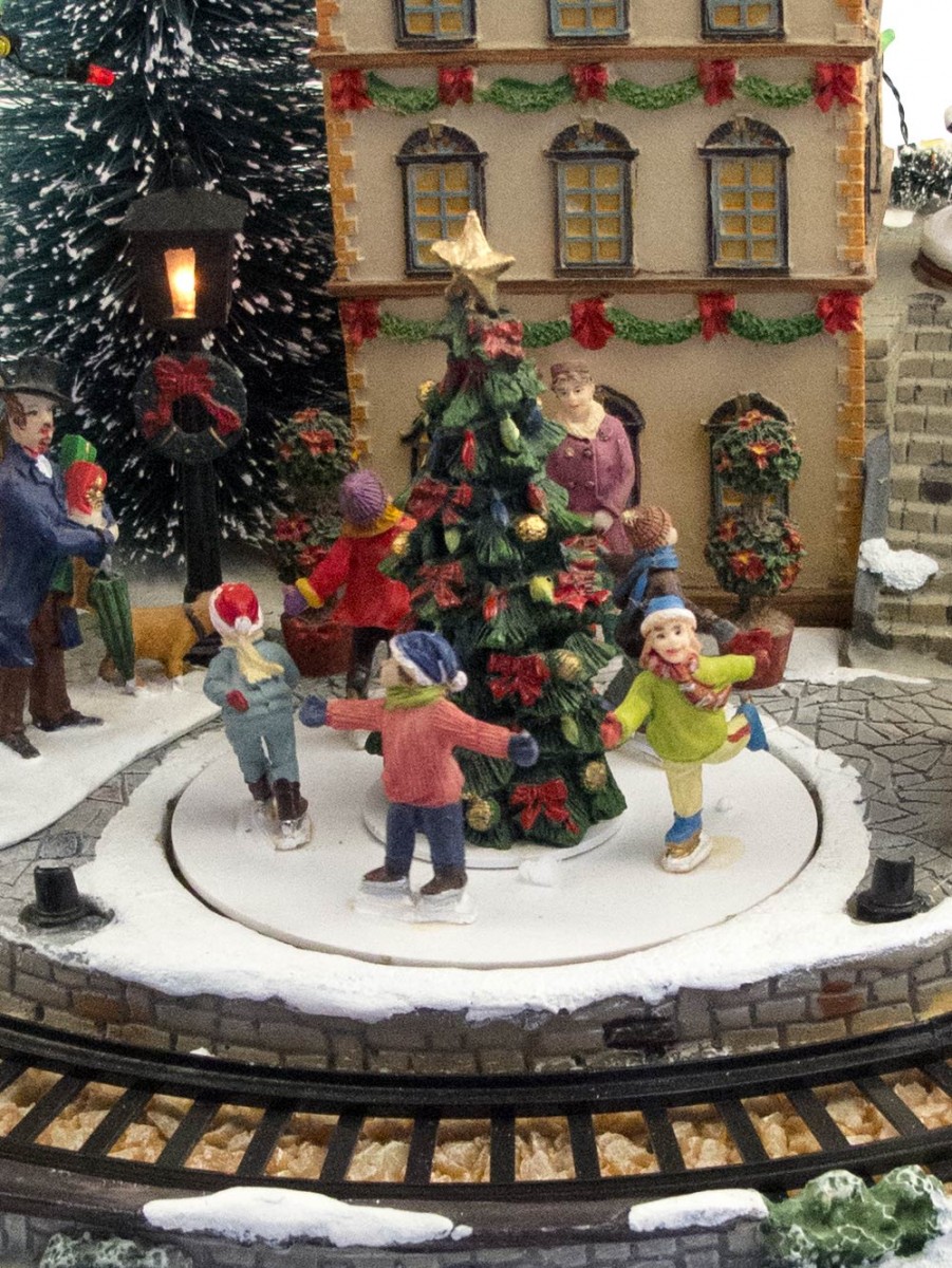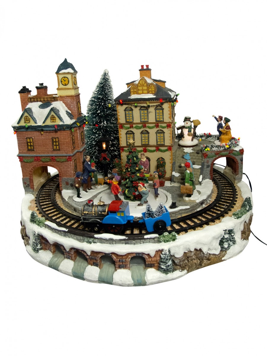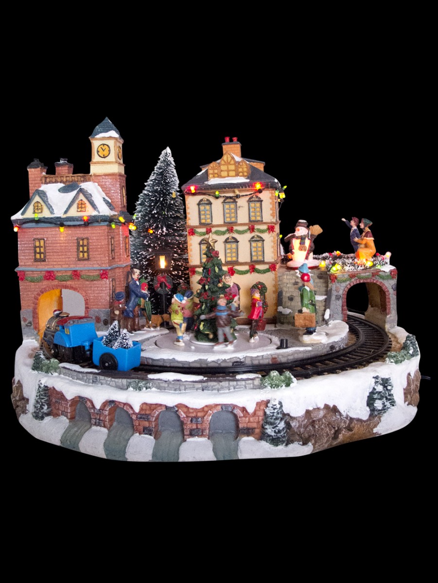 This spectacular illuminated Christmas holiday scene is filled with lovingly crafted tiny details that will delight young and old alike. The grand town square scene includes a hotel station and working train and is made from high quality polyresin. Animation vignettes include local townspeople rotating, LED illuminated snowman on a bridge, and a tree with dancers in town square. Moving train is operated by one AAA battery (sold separately). Turn the Christmas music on and off with a simple switch to complete the holiday wonderland. Scene is mains operated and measures 40 cm x 40 cm x 27 cm. This product complies with all Australian safety & performance requirements.