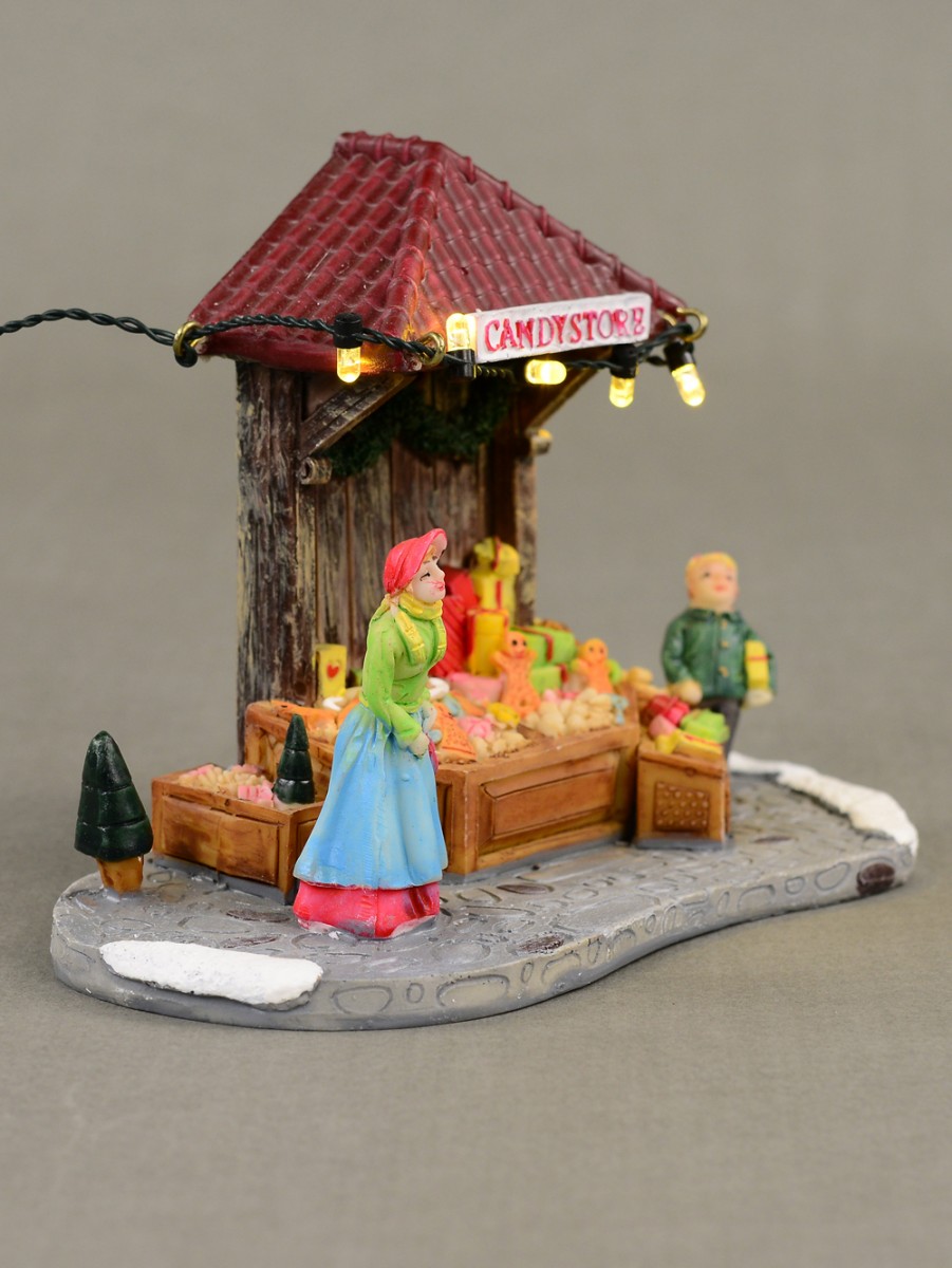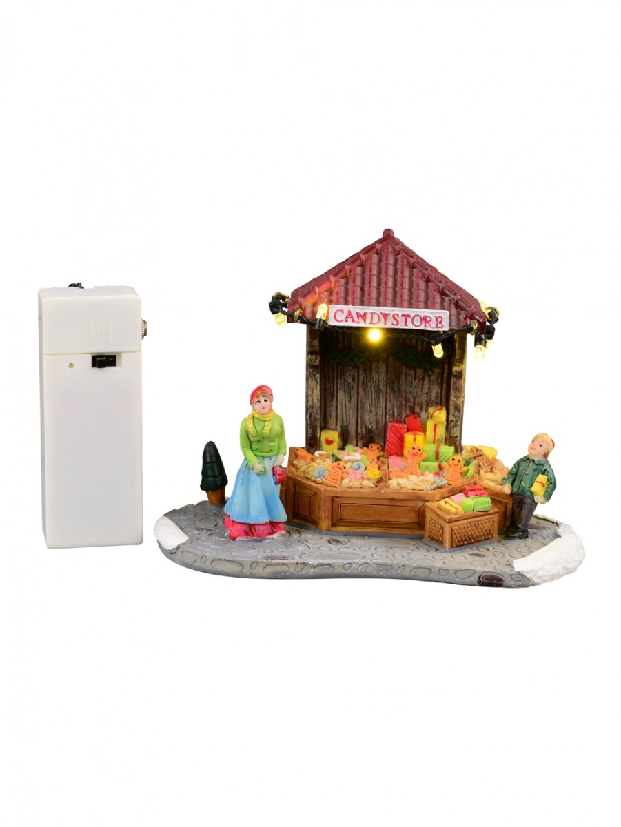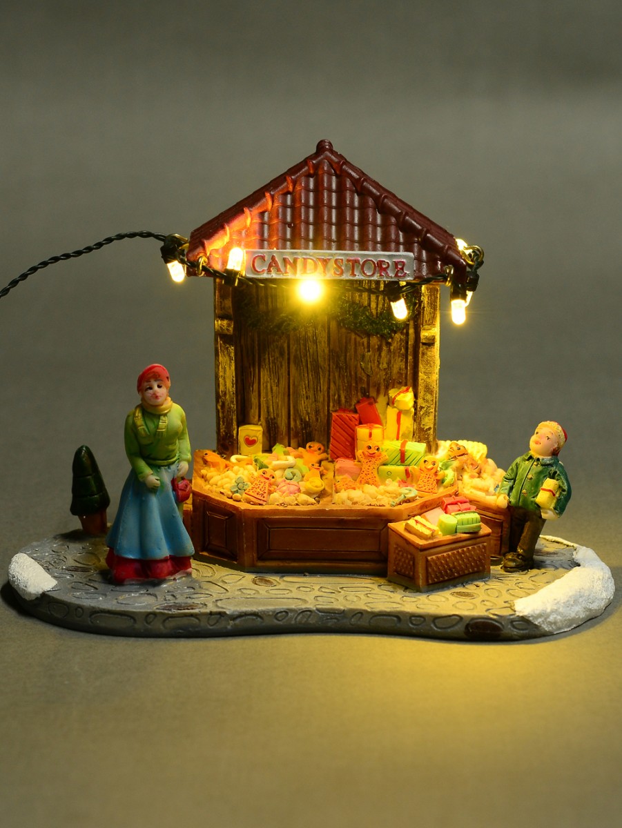 The love children have for chocolates and candies particularly lollipop is unfathomable. Such delicious treats are especially in abundance during festive seasons such as Christmas which is why this Illuminated Christmas Lolly Treats Street Market Stall Scene would make the perfect gift to give to your kids for the festive celebration. The resin made scene depicts an illuminated candy store with a chocolate coloured roof while several lollies in different colours and shapes are displayed on wooden display stands. A boy who has just bought a candy box is about leaving while the shop owner stands. Measuring just 11 centimetres, it is not too big to be handled by children.