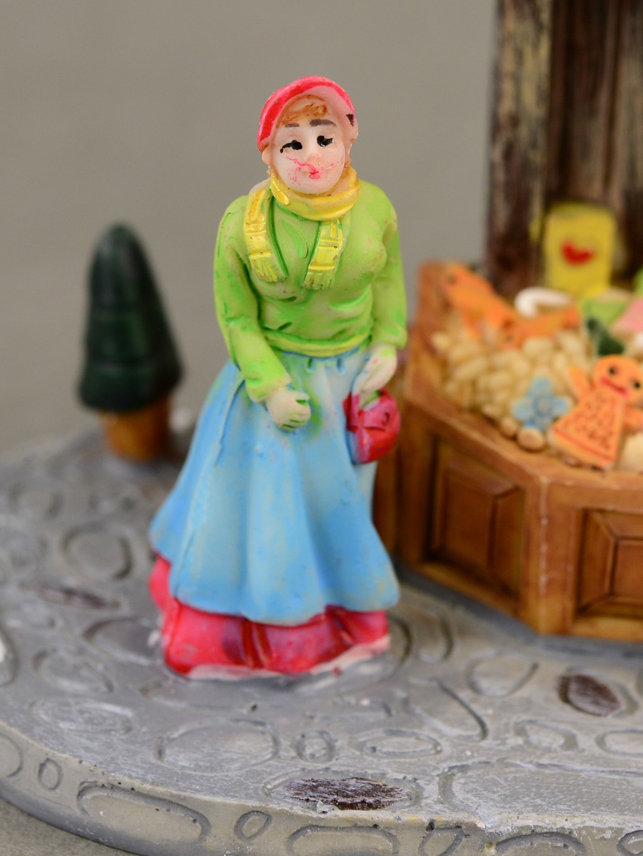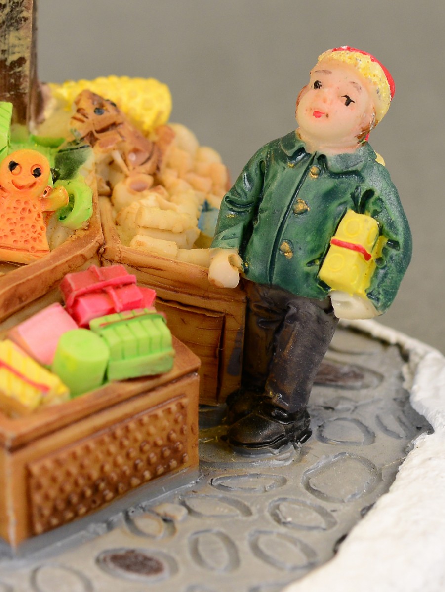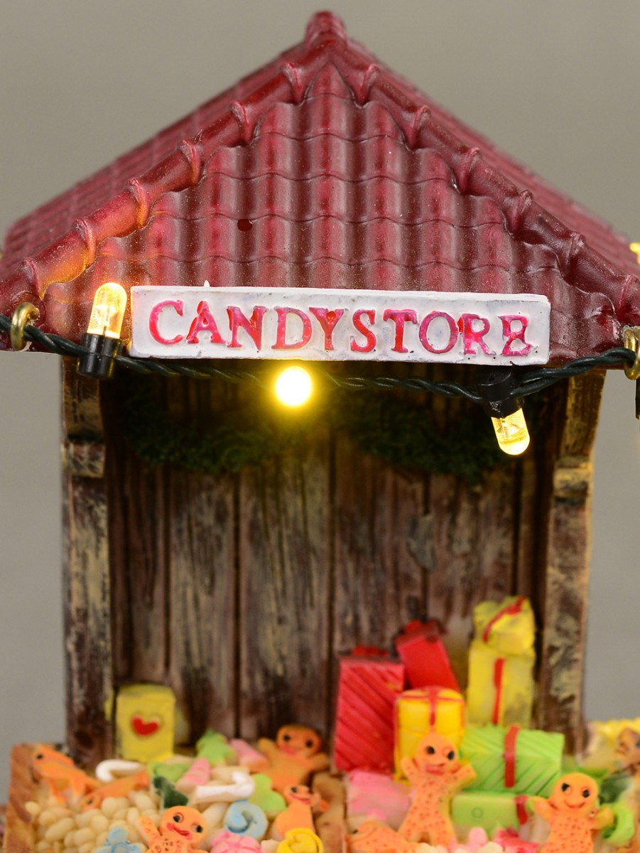 The love children have for chocolates and candies particularly lollipop is unfathomable. Such delicious treats are especially in abundance during festive seasons such as Christmas which is why this Illuminated Christmas Lolly Treats Street Market Stall Scene would make the perfect gift to give to your kids for the festive celebration. The resin made scene depicts an illuminated candy store with a chocolate coloured roof while several lollies in different colours and shapes are displayed on wooden display stands. A boy who has just bought a candy box is about leaving while the shop owner stands. Measuring just 11 centimetres, it is not too big to be handled by children.
