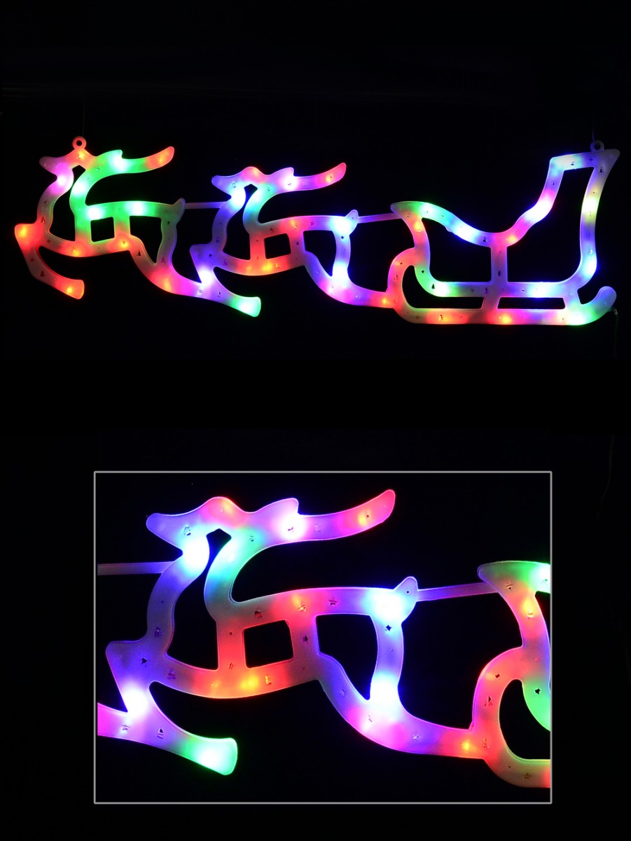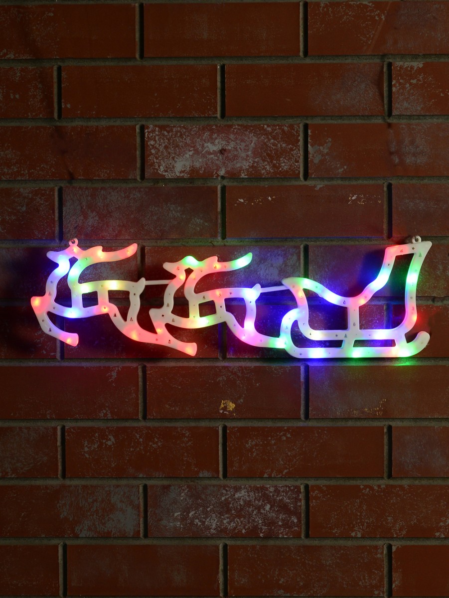 Christmas light displays are an absolute must if you want to spread the holiday cheers around, and this sleigh & deers display is just the thing to brighten up your home or office! This bright and colourful piece depicts two rainbow-coloured reindeer pulling along a sleigh, portraying a cheerful and whimsical scene for all to witness. Add the flashing special effect pattern of the lights and you have the perfect choice for when you just want to make things feel more Christmas-y around the place. The display itself stretches out 57cm long, with a height of 18cm. The individual piece of the display are connected by electrical cord with a 5m extension cord, which in turn supplies power to 42 individual light bulbs. The set comes with a plug that plugs into a 240v outlet. We also have a lot of other holiday decor that goes well with this line of Christmas light displays. Simply browse through our catalogue and pick out whatever piece catches your eye!