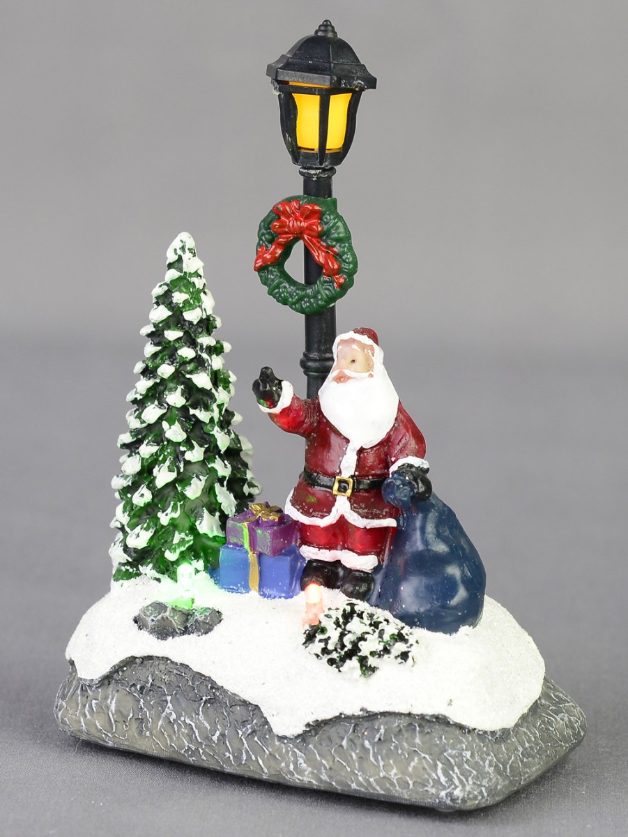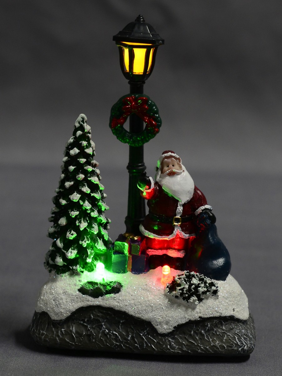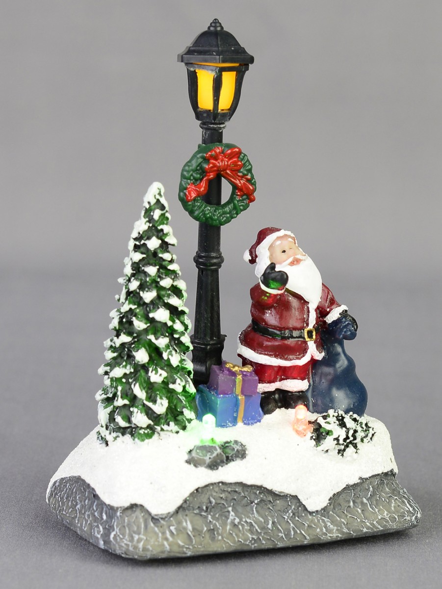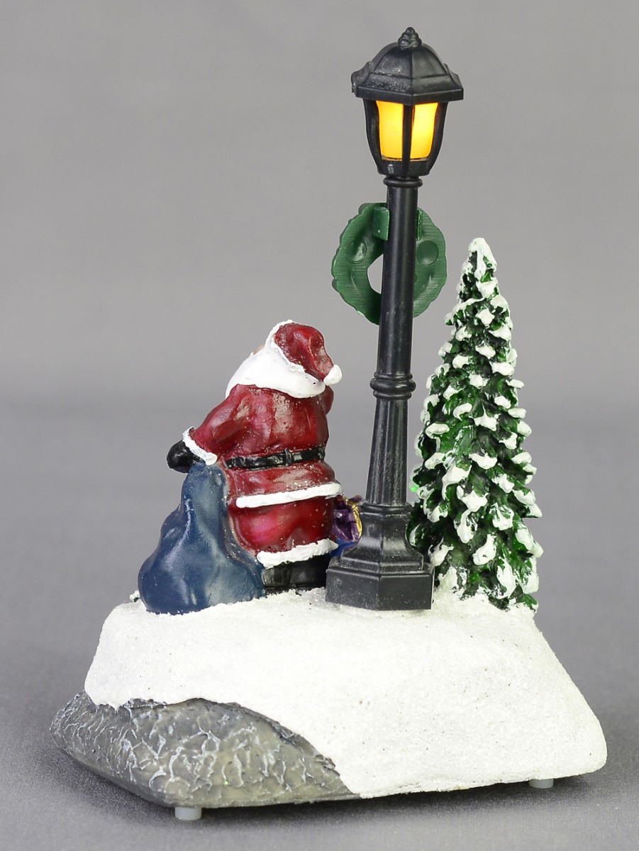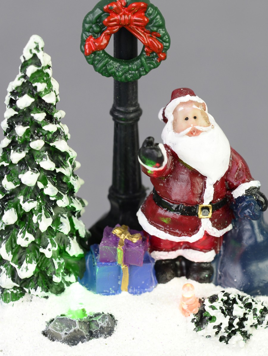 This scene features Santa carrying his sack and waving under a traditional black lamp post that has a lovely wreath near the top and gifts at its bottom. There are small red and green LED lights that will highlight the tree and Santa during dark evenings, while the lantern emits a soft golden glow. It is ideal to decorate a mantelpiece, entryway console, window ledge or even a bookcase or the side table. Spreading seasonal joy to everyone that crosses his path, this Santa will bring a smile on their face and make a wonderful Christmas gift to a loved one.