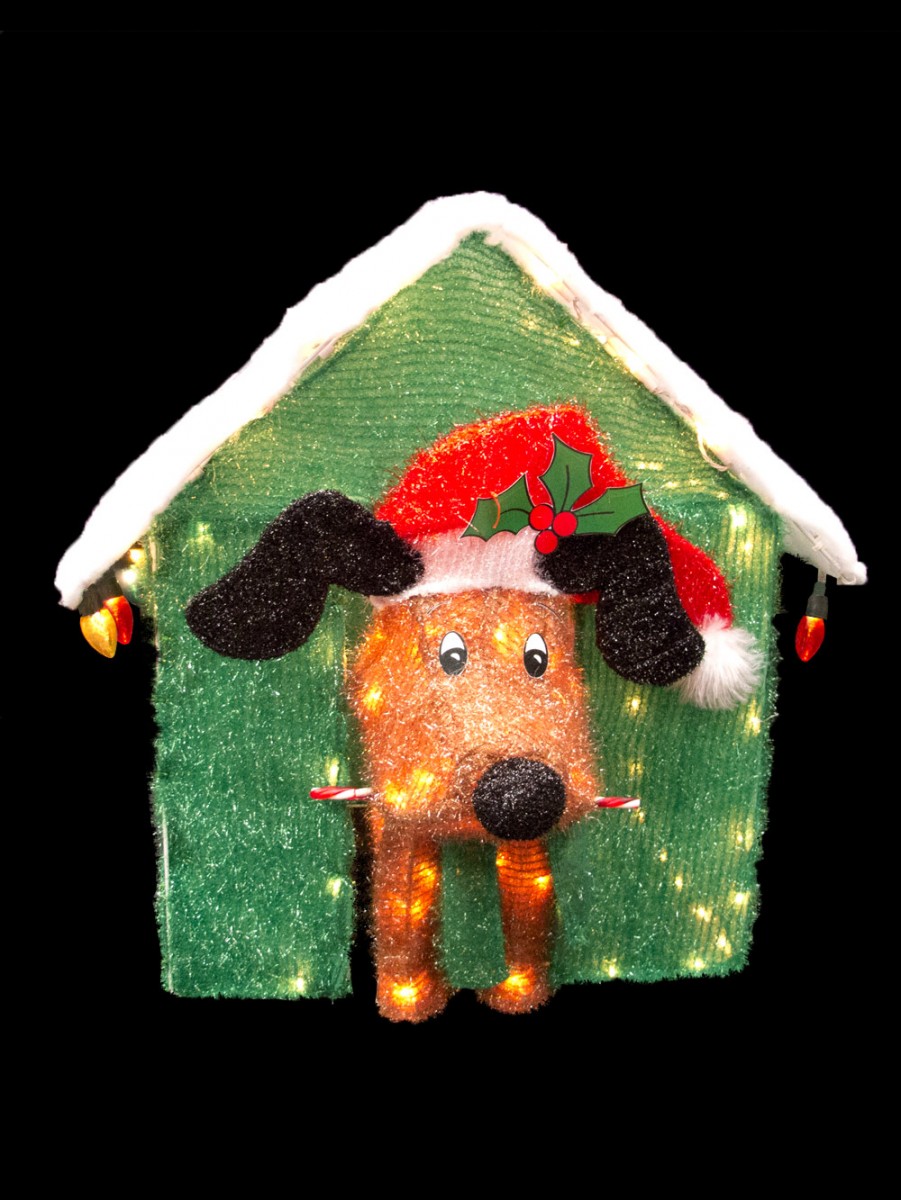 For homes of dog owners, or businesses such as pet supply stores, and veterinarian offices, this illuminated display is simply irresistible. It is a must have for dog lovers to add to their Christmas decorations. The tinsel fabric brown dog sports a comical expression on his face as he peeks out from his shiny green kennel topped with snow. His bright red Christmas hat adds extra humour to an already funny scene. This Merry Christmas dog and kennel measures 580mm x 590mm x 600mm, with a 2 metre lead. A string of 10 x C7 multi-coloured bulbs hangs from the snow-covered kennel.