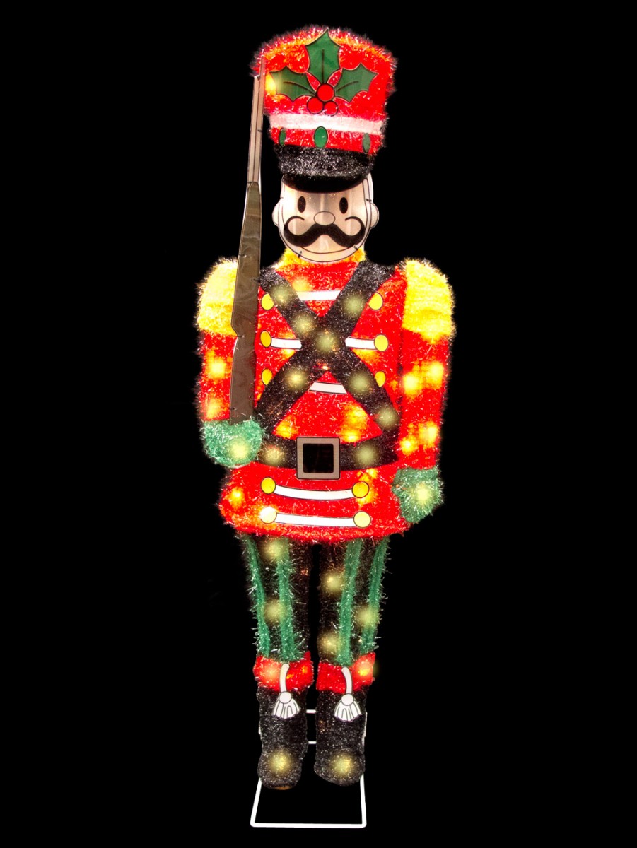 Once plastic was invented, and lead in metals became a health concern, inexpensive packs of plastic toy soldiers were produced and then purchased in droves by parents of boys to use as stocking stuffers. Baby boomers in particular have fond memories of hours spent fighting imaginary battles with toy soldiers. This grandiose illuminated display of a toy soldier from the Christmas Nutcracker ballet features a colourful uniform of red, green and black tinsel fabric. The soldier, standing at attention, proudly carries a PVC musket.