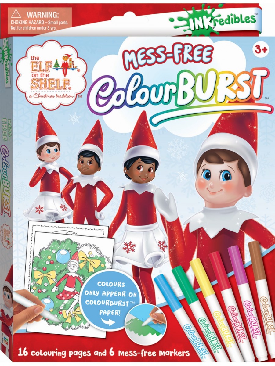 Children will love colouring their way through fun and festive Christmas pages with Inkredibles: Elf on the Shelf Colour Burst ... and, as a bonus for parents, it's the ideal mess-free activity! The amazing Colour Burst markers mean that ink will only appear on the page, not on furniture, pets or people! The Colour Burst series is perfect for on-the-go, mess-free colouring and means no more ruined furniture or frantic skin scrubbing! The colouring pages also feature hidden patterns and designs that are revealed only by the markers in this kit!