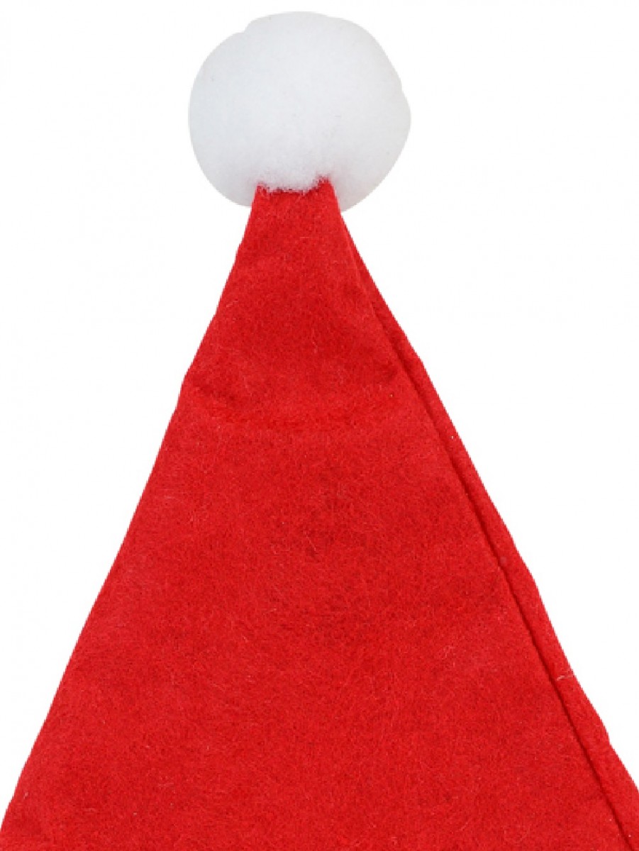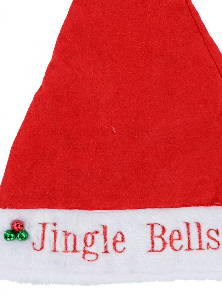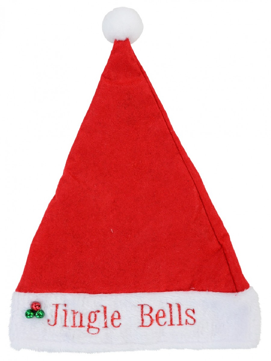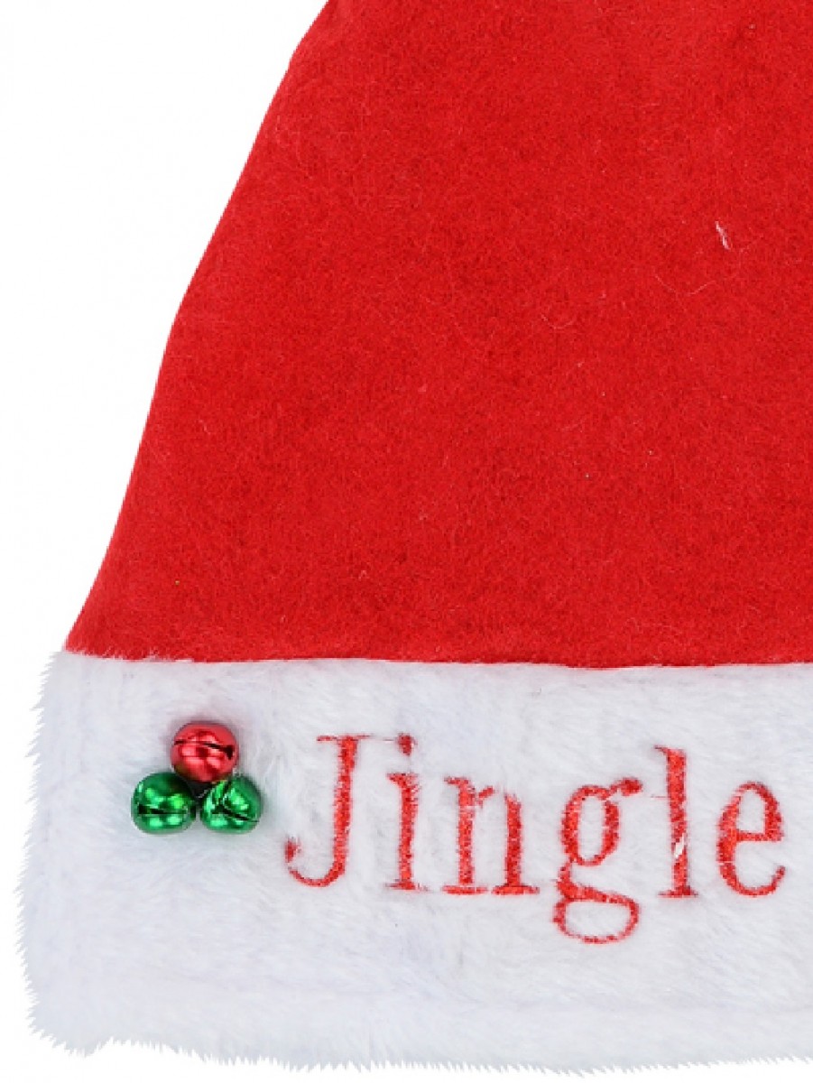 Just like the instruction from Santa Claus to 'Jingle Bells', this hat actually obeys the instruction with its three colourful bells of red and green sewn into the white fluffy cuff of this Santa felt hat. The hat is made of soft, smooth felt material in a cone shape that is consistent with Santa's hat. At the top of the cone shaped hat is a fluffy pom pom in white. The base of the cone shaped hat is also a white fluffy faux fur cuff on which the instruction is embroidered in red. Close to that, at the left side are 3 bells in green and red. The remainder of the hat is coloured in red.