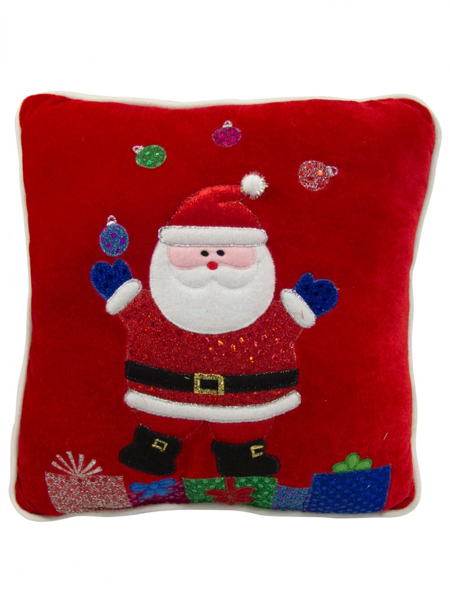 Perk up your parlour this holiday season! If you think the couch might be looking like it needs a bit of Christmas spirit, this red velvet cushion is the answer to the problem you didn't even know you had. Soft red velvet features white fleece piping around the border. Design on the fron features Santa wearing a red sequined suit and edged in silver metallic thread. Blue sequined mittens and a red had with real white pom pom complete his look. An assortment of sequined Christmas presents are at his feet as Santa juggles an impressive number of sparkly, sequined baubles. Cushion measures 30 cm x 30 cm.
