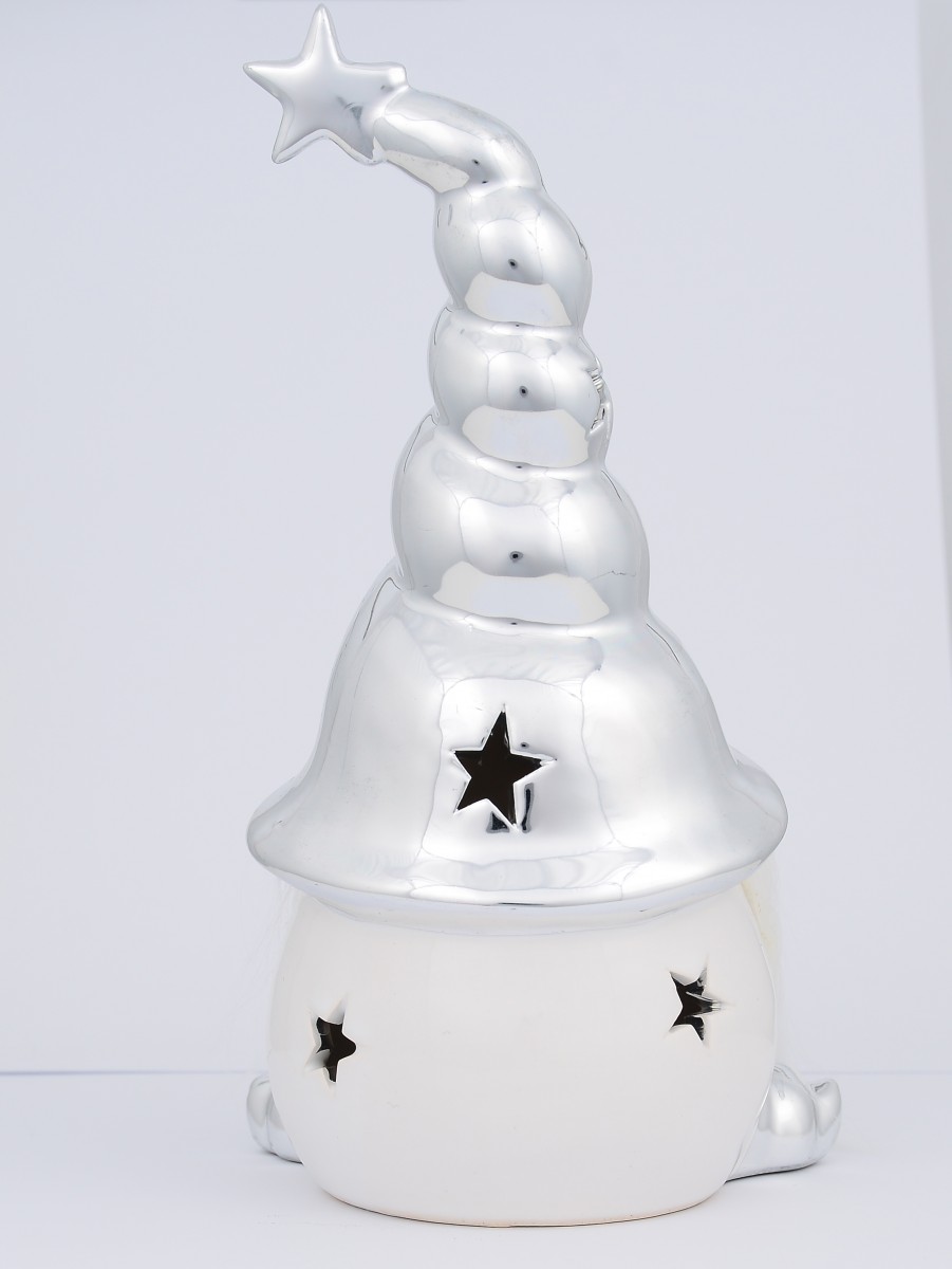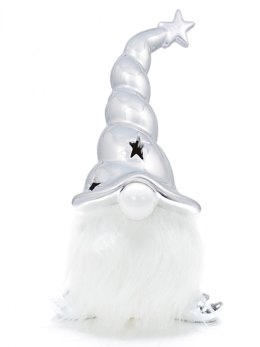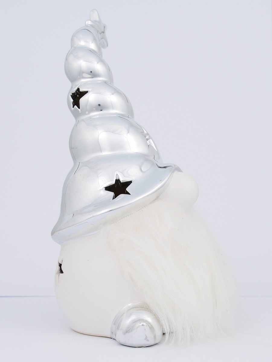 Wow your guests with your elevated decorative keenness by choosing to buy and display this Large Nisse Santa With Glorious Beard Ceramic Christmas Ornament in strategic locations around the house, office, shop, and wherever else necessary. To achieve the most ornamental effect, it can be placed in places such as the top of mantelpieces, display shelves, dinner tables, consoles, and living room centre tables. This Santa themed ceramic is moulded in such a way that Santa's chubby body is glossed in white while his wriggled wizard looking hat has cut out star shapes and a star topper all finished in silver coloured glazing.