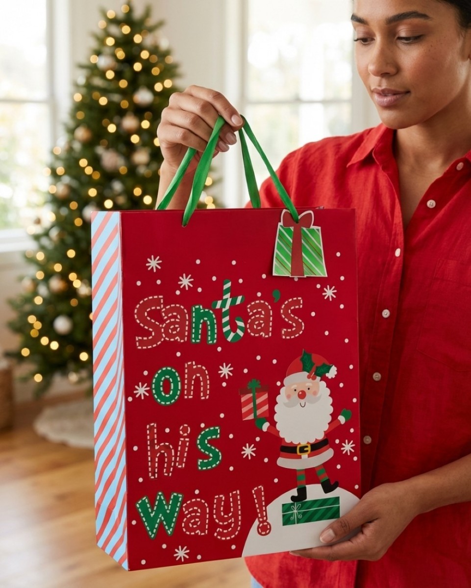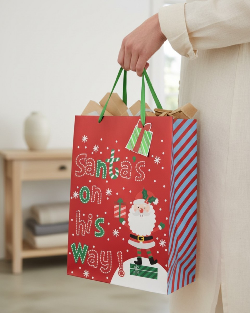The festive print has that playful touch we love - green and red “Santa’s On His Way!” text, bright blue and red diagonals down the side, and an adorable Santa bringing pressies. There's a mix of finishes too: glossy front for a bit of shine, matte reverse for a touch of sophistication, all on quality 210 GSM paper with sturdy aglet-ended ribbon handles.