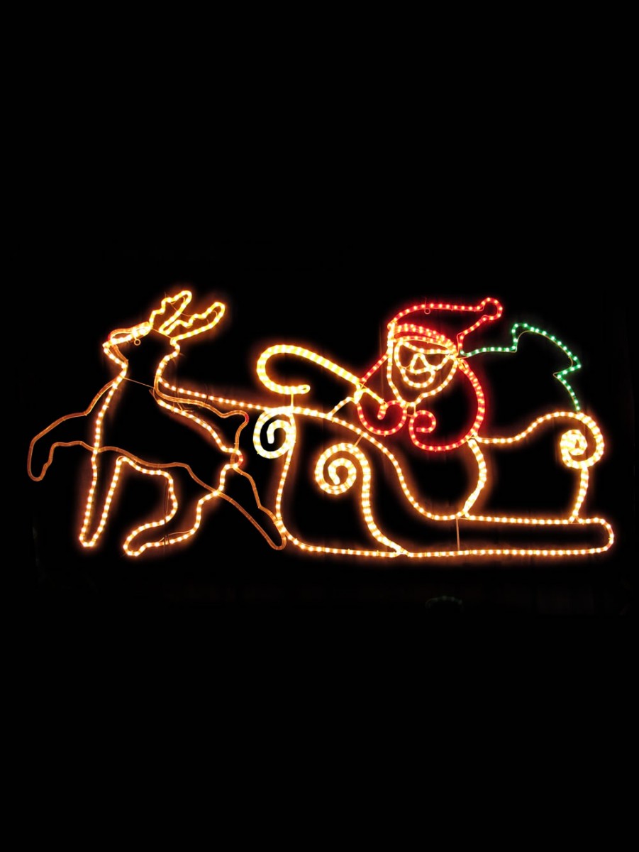 This gigantic display features Santa riding his sleigh pulled by a reindeer. Measuring a massive 206cm long by 92cm high, this light display is sure to catch the eye of anyone walking past, as well as fill up empty space in your lawn. Made of rope light silhouette, this multi-coloured display is also animated. The reindeer's legs move back and forth and he flies Santa's sleigh proudly through the air.
