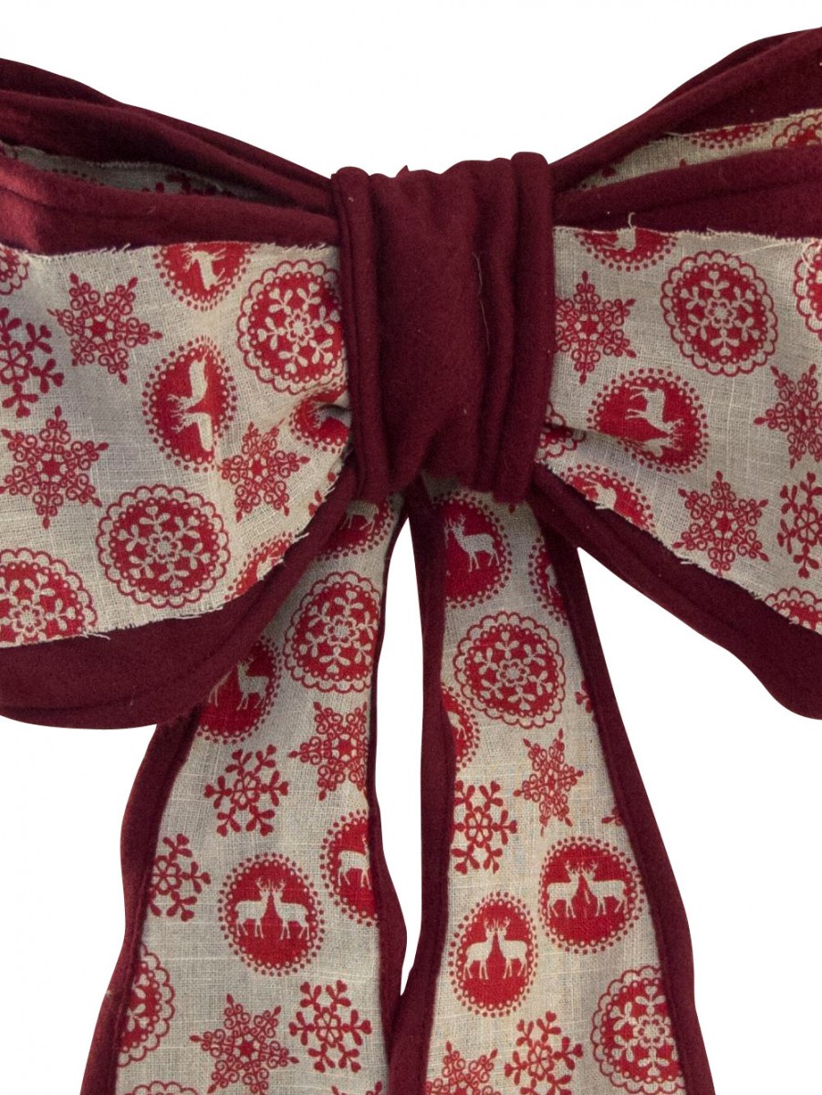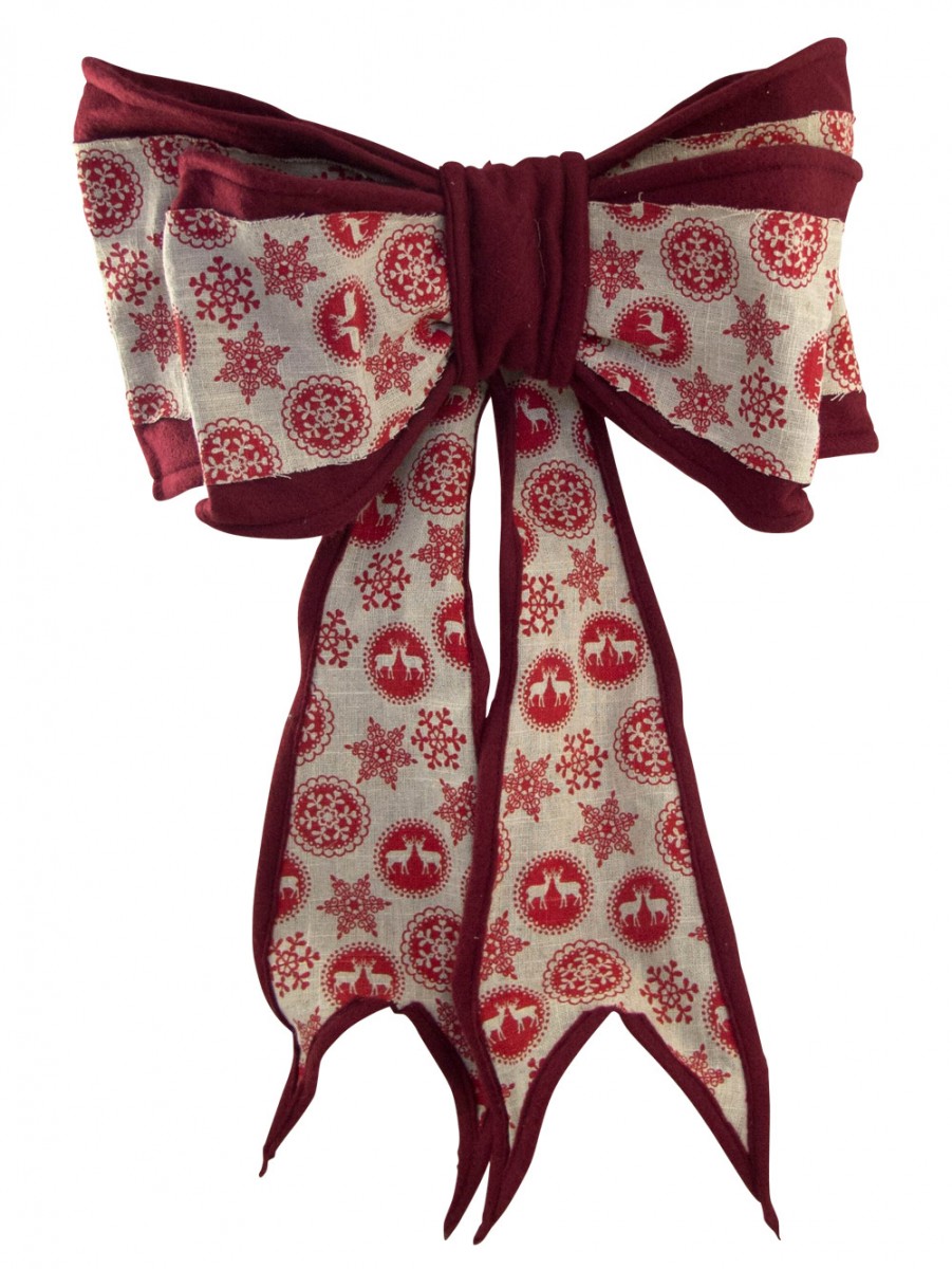 Today, you will find numerous Christmas decorating pieces with an ultra modern feel to it. But when this season comes, nothing beats the classic, more traditional pieces almost everyone grew up with. The Large Snowflake Printed Pattern Hessian Bow is exactly that. This bow is quite simple in design but nothing can be more striking. Pre-tied, the whole thing measures a little over 43cm in horizontal length and nearly 58cm in vertical length. The width of the ribbon is at 10cm. The sides of the ribbon and the backing are made of burgundy felt. The middle part is made of hessian. The knot of the bow is sewn over with the same hessian and felt fabric, giving it a clean appearance. It is quite large so it would look better pinned as the centrepiece of a large wreathe. If you own a gigantic Christmas tree, getting numerous pieces and using these with colourful tin balls may work. But several of these would crowd petite trees.