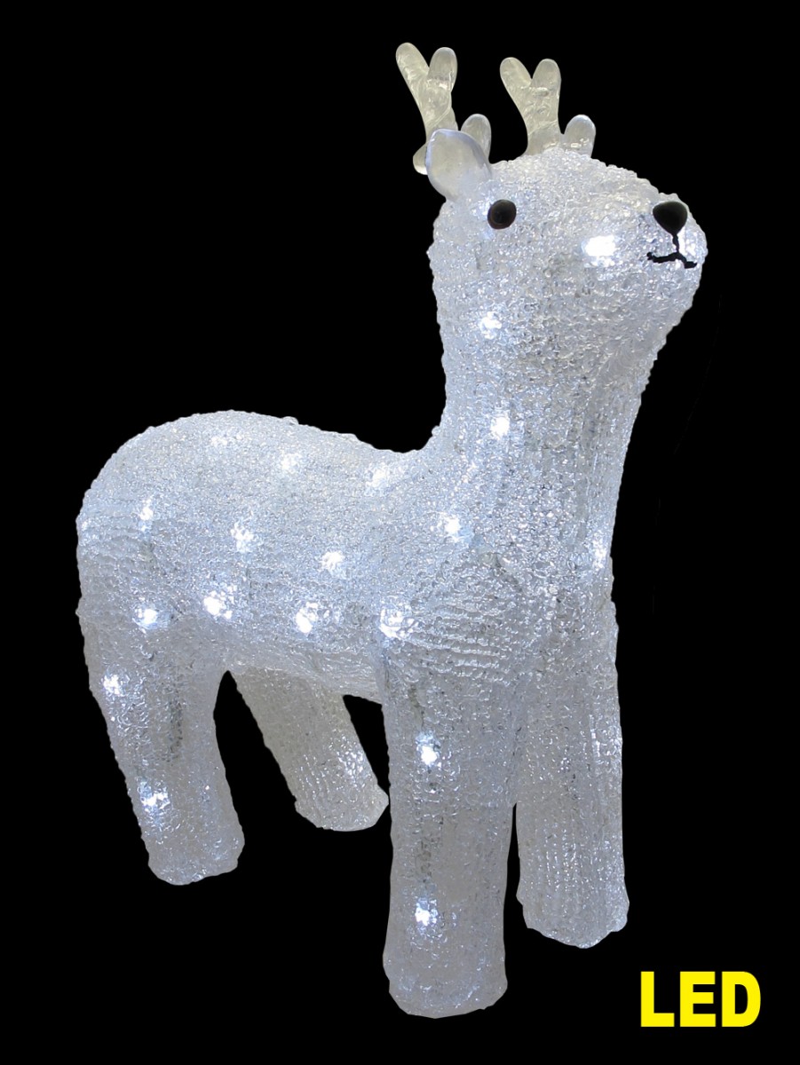 This light-up reindeer is made of a clear, textured acrylic material. Inside, 40 white LED bulbs shine brightly, illuminating the reindeer. LED bulbs are more durable than standard bulbs, more energy efficient and also shine brighter with a breath-taking blue hue. A classy white colour, this reindeer can be used as decoration in the most sophisticated of settings, or a cutesy, woodland-themed display. The reindeer measures 32cm X 37cm X 11cm and would look nice indoors on a table or standing on the floor next to the fireplace. It is also suitable for outdoor use. You can combine this reindeer with other outdoor decorations to create a wonderland scene in your own yard. The LED lights inside are sure to shine brilliantly against the dark night sky and impress all of your neighbours. This LED light display is a great price for a quality item. The reindeer is sure to light up any space you put it in and bring the warmth of the Christmas spirit. For more items like this one, be sure to look at the rest of the offerings from the Christmas Warehouse.
