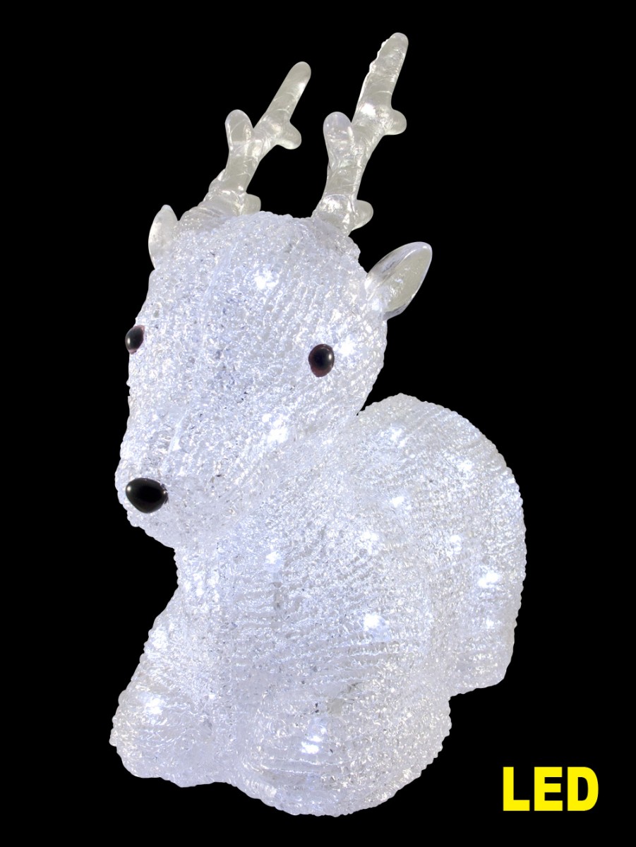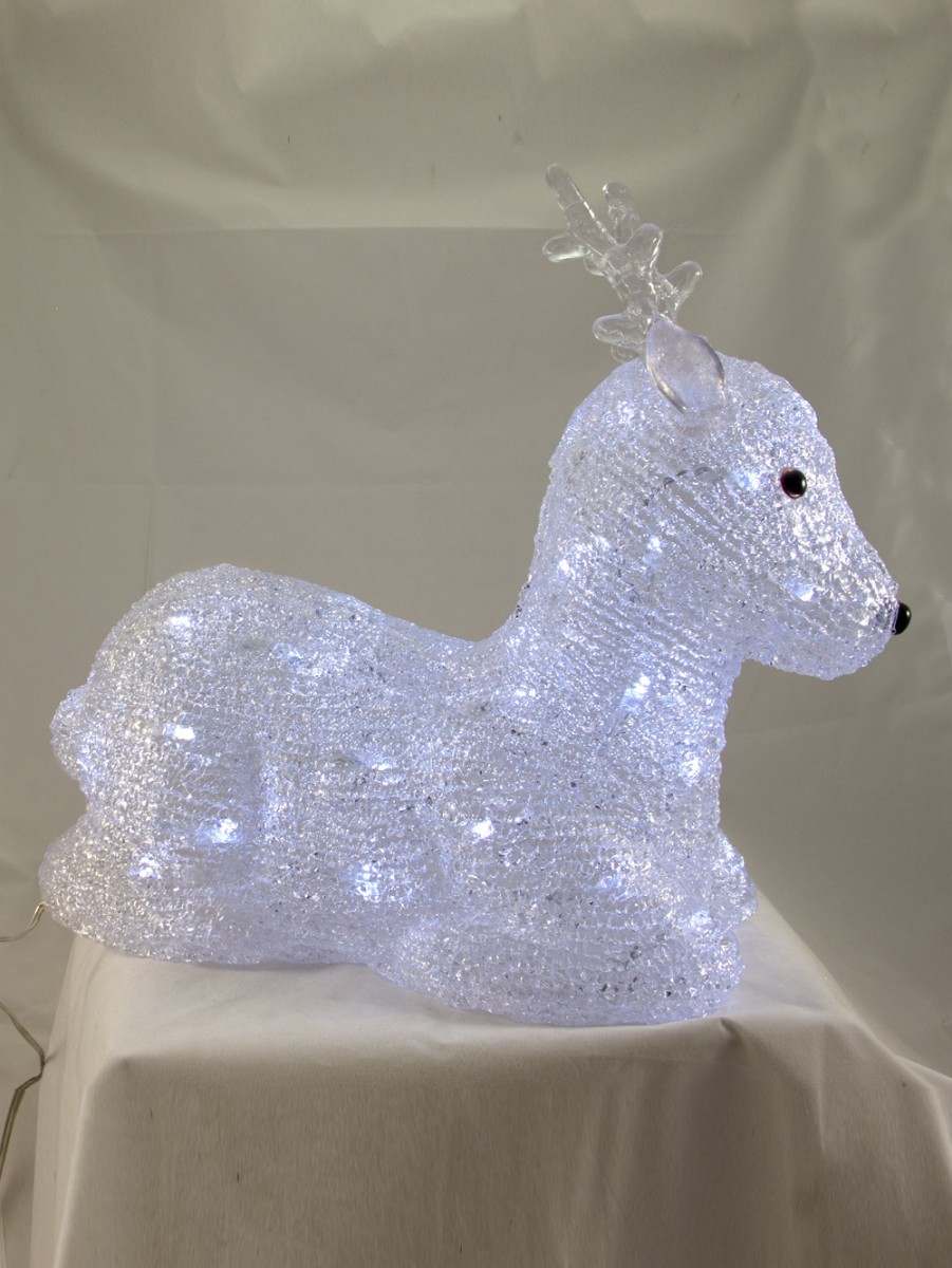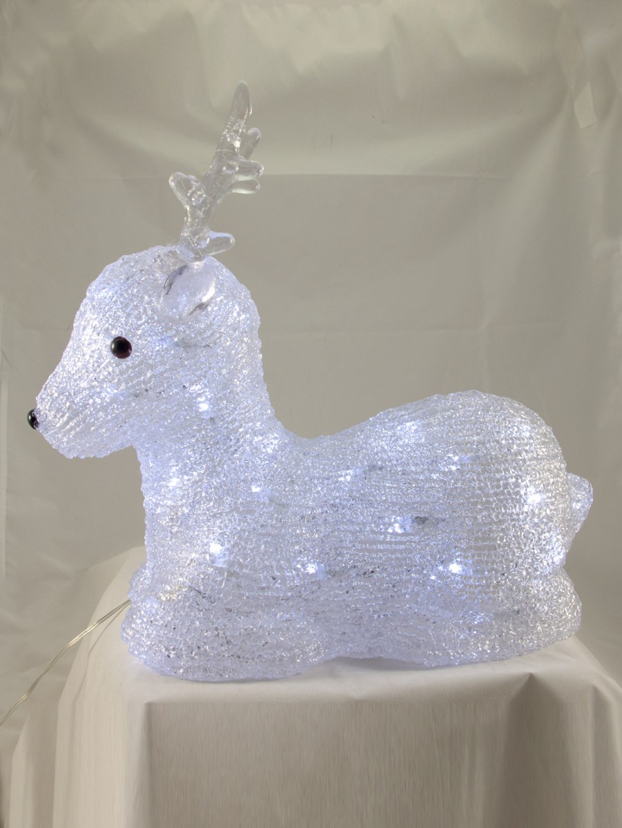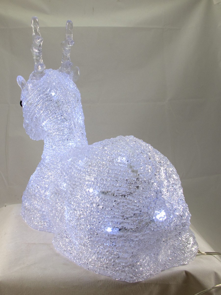 Most reindeer walk slowly from place to place, unless a predator frightens them. When necessary, these animals can run as fast as 80km per hour to escape a potential attack. Reindeer feature majestic antlers and are accustomed to the freezing climates of their habitats in Alaska, Canada, Russia and Scandinavia, where they live and graze on tundra plants. This gorgeous representation of a seated white reindeer is made of clear textured acrylic, spun with 40 white static burn LED lights. One of the most endearing of Christmas decorations, this reindeer is sturdy enough to be displayed outdoors as well as indoors, and measures 350mm x 300mm x 145mm.