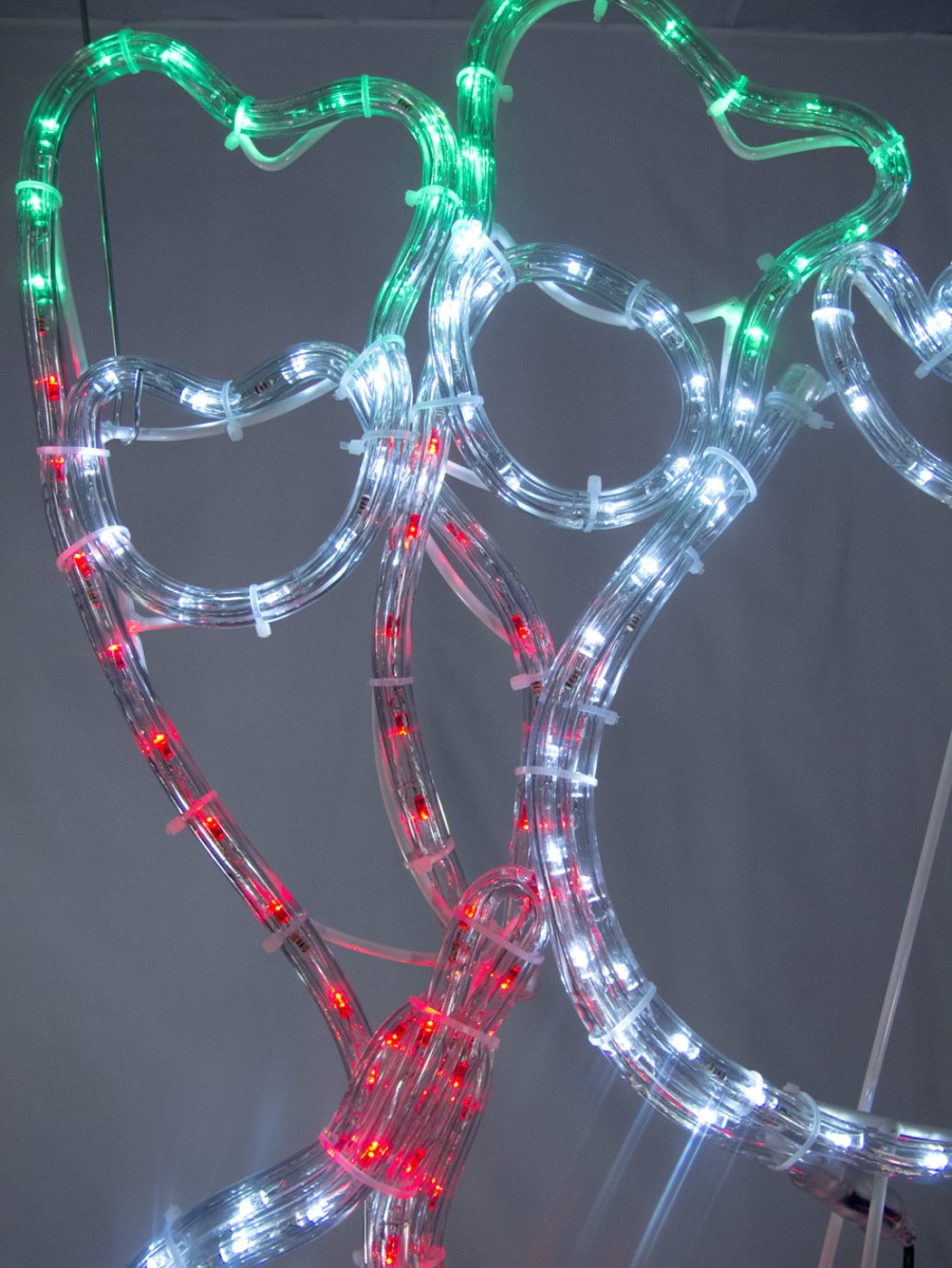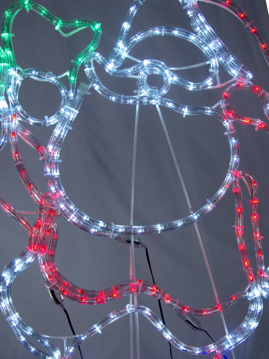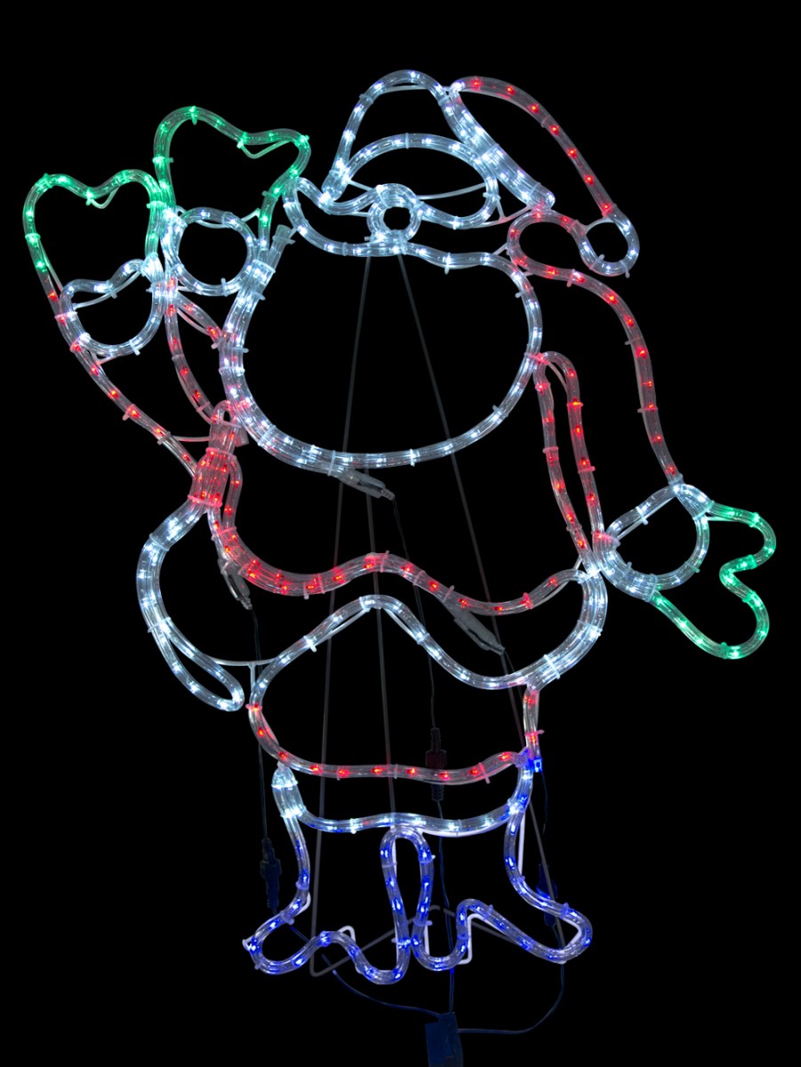 ? Safe LED lights are encased in durable plastic tubing and outline the form of Santa, with alternating lights in one arm that makes him appear to be waving.