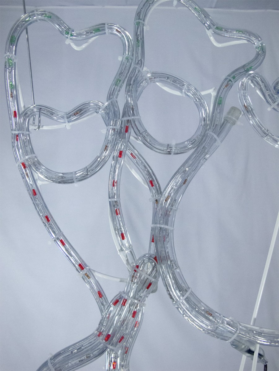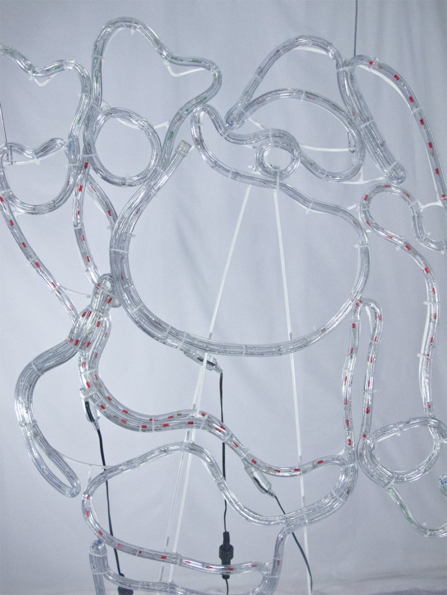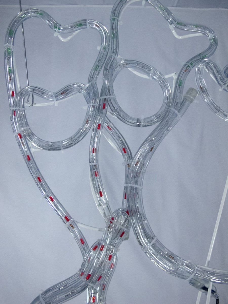 ? Safe LED lights are encased in durable plastic tubing and outline the form of Santa, with alternating lights in one arm that makes him appear to be waving.