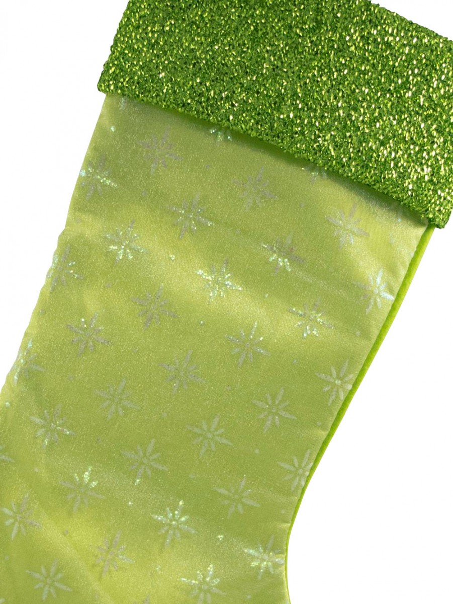Clear organza stocking with iridescent snowflake design over lime green satin with metallic green tinsel fabric cuff