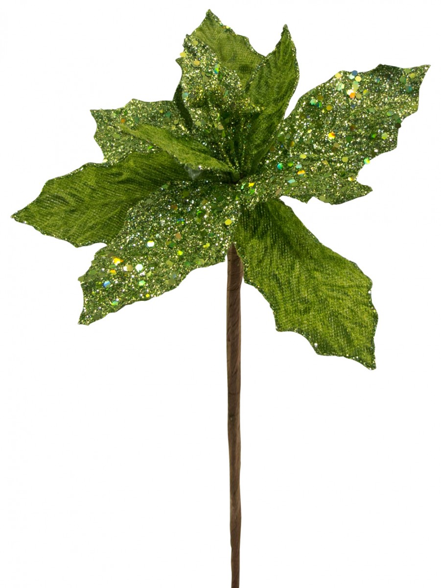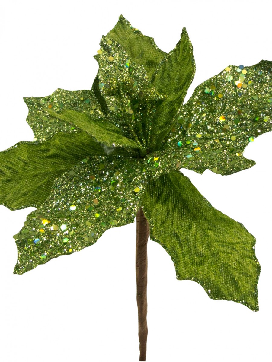 If you prefer to make your own centrepieces and floral arrangements rather than buying store bought, or are looking for something to add some pizzazz to a pre bought arrangement, this type of decorative Christmas pick is ideal. This pick is sold individually, but purchase one or more for more elaborate arrangements, or mix and match several different types to create a unique Christmas centrepiece. A lime poinsettia pick that includes both glitter- and sequin- encrusted petals alongside lime fabric petals edged in glitter. This pick can complement a variety of settings- simply unpack and add to whatever part of your home needs a bit of holiday cheer! Dimensions are 16 cm x 16 cm x 17 cm.