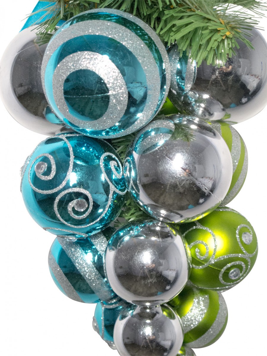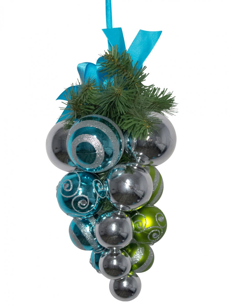 This impressive Lime, Silver & Turquoise Grape Cluster With Ribbon Bow decoration will light up just about any area of your home - or office. Measuring 20cm in length, 20cm in width and 27cm in height, it's the perfect choice for a door-frame decoration, or for any open space. This elegant chain of baubles is light and elegant, meaning that it can be hung from furniture, front doors, and perhaps even ceiling lights. If draping is more of your thing, consider using it as a table centrepiece or as a highlight for your mantelpieces. Christmas decorations don't get much more stylish than this hanging cluster decoration. With its multiple silver, turquoise and lime baubles, its elegant PVC pine, as well as its turquoise ribbon highlight, it's a great way to bring in that Christmas spirit in a way that's nothing but pure elegance. If you want to deck out your house or office with something more than the standard Christmas tree, then you'll love these stylish hanging bauble clusters. Not only are they eye-catching and versatile, but they're pitched at a price that's hard to ignore--something that should get you to feel a little extra Christmas cheer!
