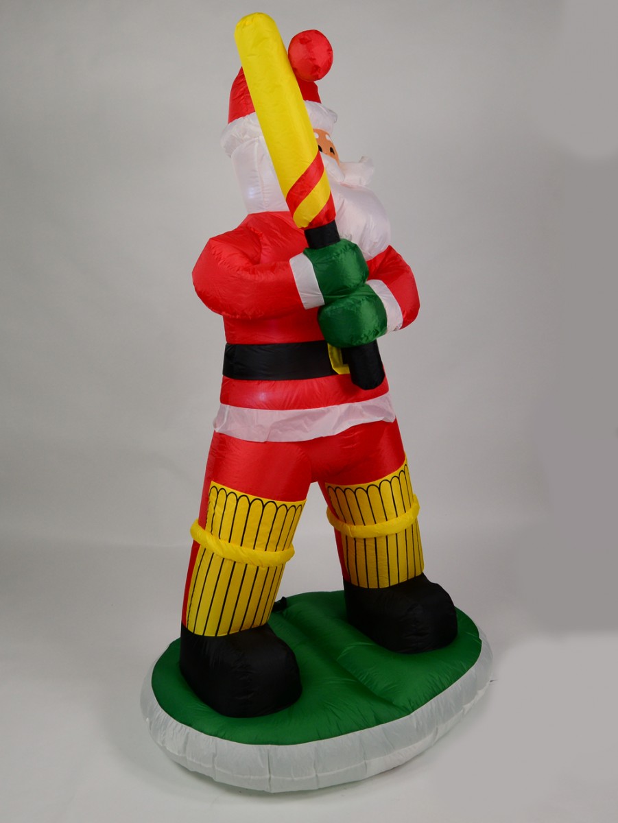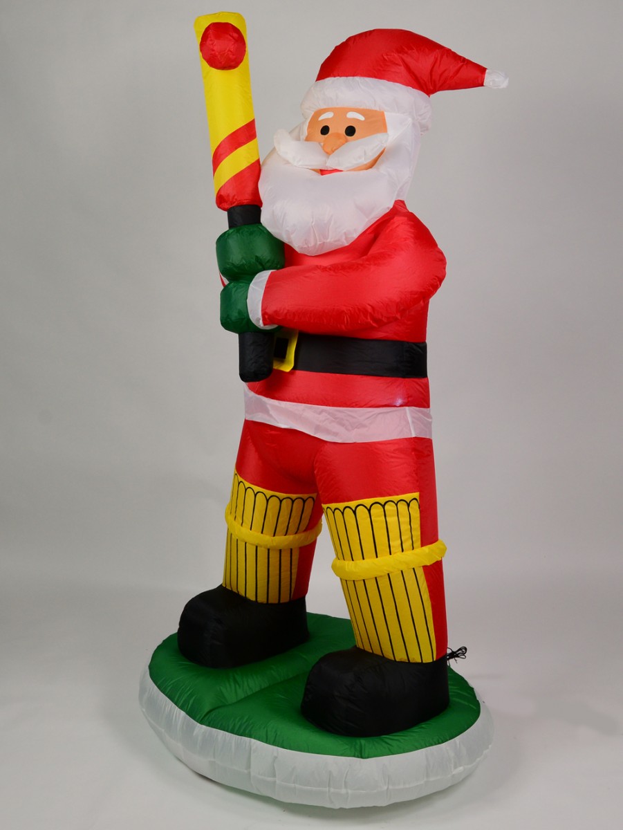 The Batsman Santa Tipping One Over The Wicky Illuminated Inflatable is a 1.8 metres tall inflatable that showcases ingenuity in design as it depicts a well-detailed sportive nature of the legendary Santa Claus. As is the usual with Santa, Santa is depicted as having his distinctive white beards, red felt hat with white cuffs and pom pom, red robes with white fluffy cuffs and trims, and gold buckled black belt to gird his robe. The only difference is that his robe is shortened so that he can easily attend to the matter at hand - that of hitting the ball. It is perfect as living room decoration.