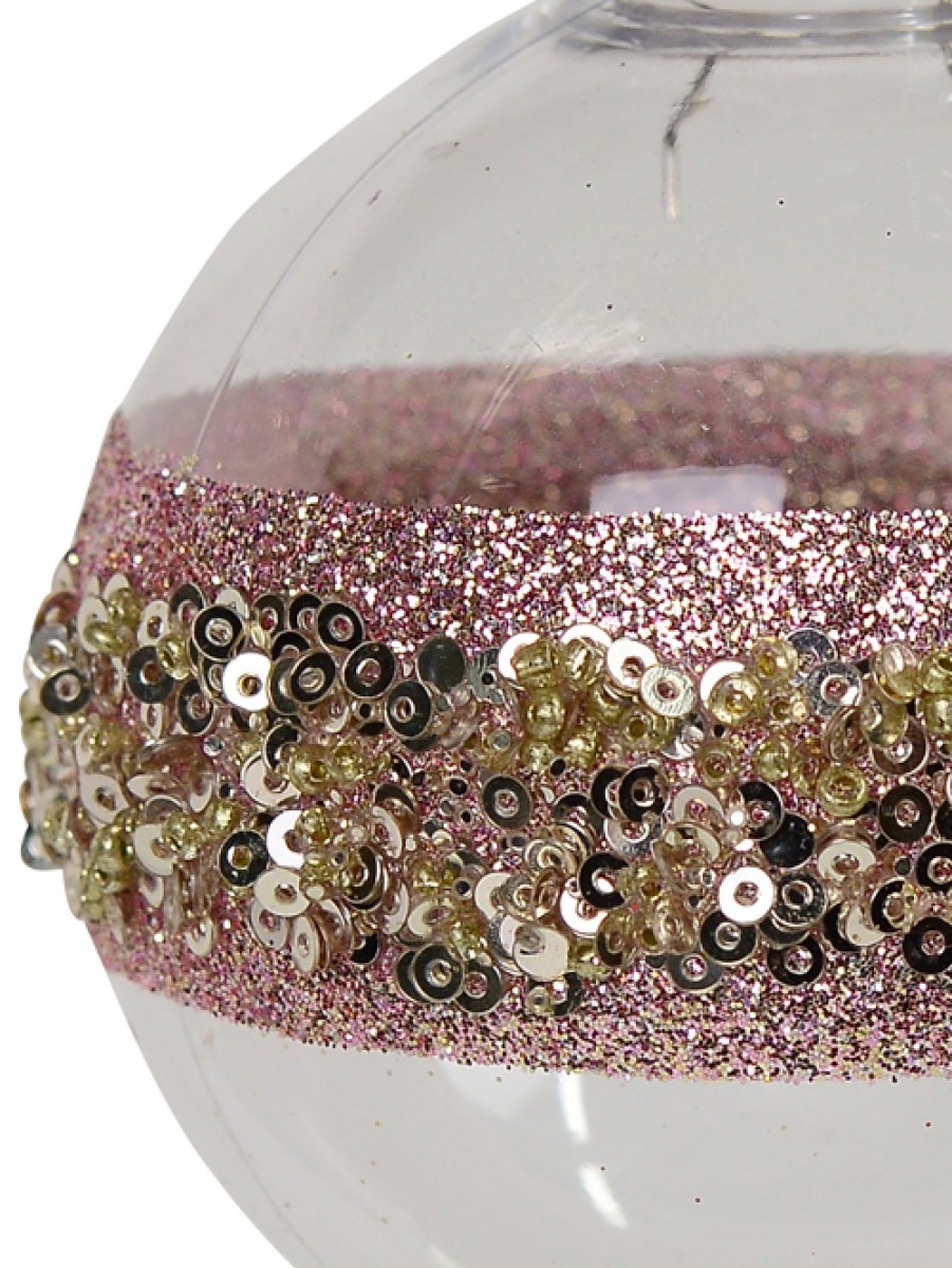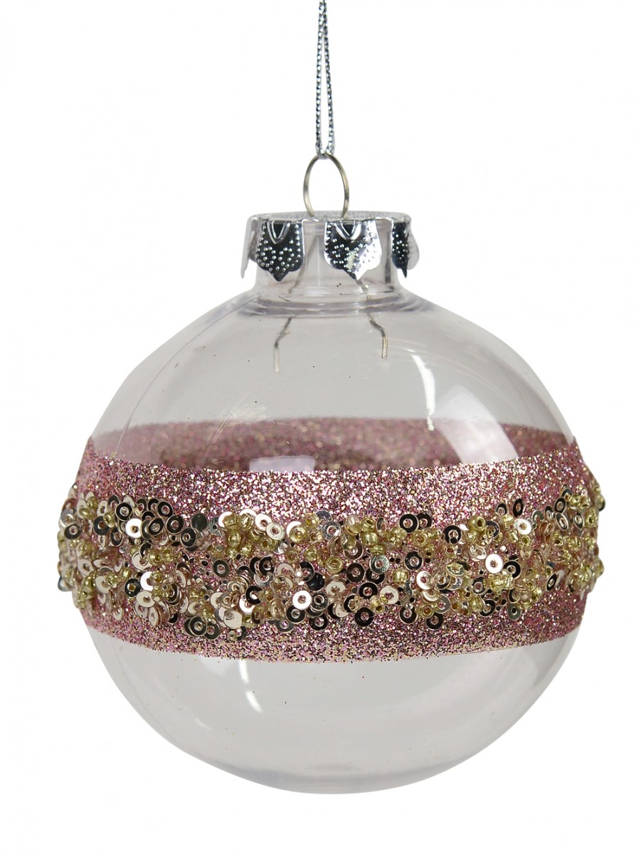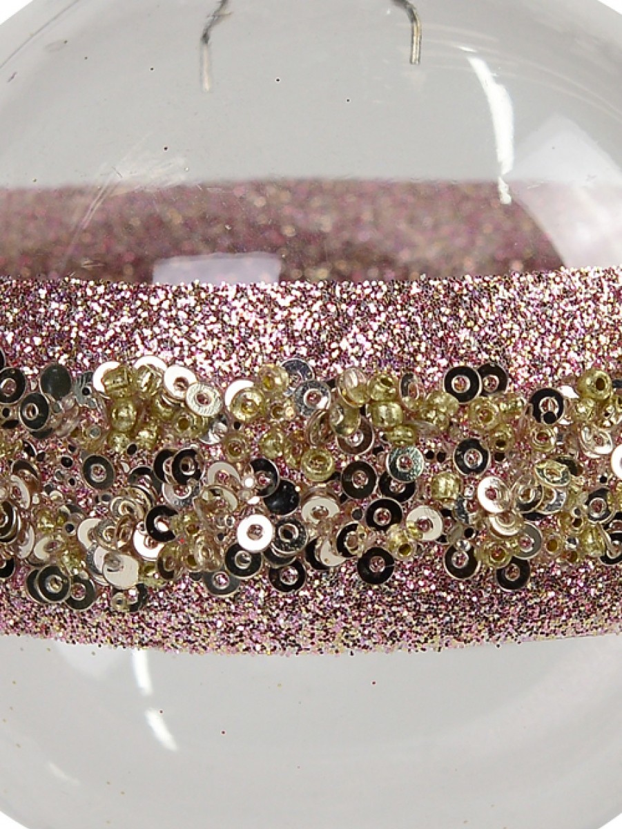 Easy to decorate, glitzy, and an excellent way to get that Christmas cheer started, this clear and mauve bauble with embellishments is just the thing you need this holiday season! This sparkling spherical ornament in clear design has a wide strip of mauve glitter with lovely rose gold sequins and gold embellishments that add a shimmering finishing touch.