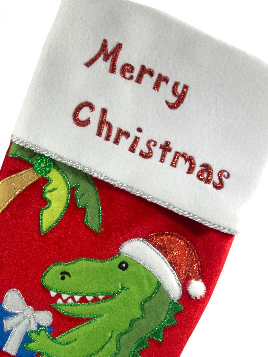 The stockings will be hung by the chimney with care when you use one of our felt stockings! Hanging up stockings has been a cherished holiday tradition for years. Continue it with your family with this red velvet stocking. The design features a dinosaur holding a Christmas gift amongst a setting of palm trees. Metallic thread is used throughout the design and the dinosaur wears a Santa had featuring a pompom. White stocking cuff includes embroidered �Merry Christmas� greeting. Includes a red velvet loop for easy hanging. Dimensions are 27 cm x 47 cm.