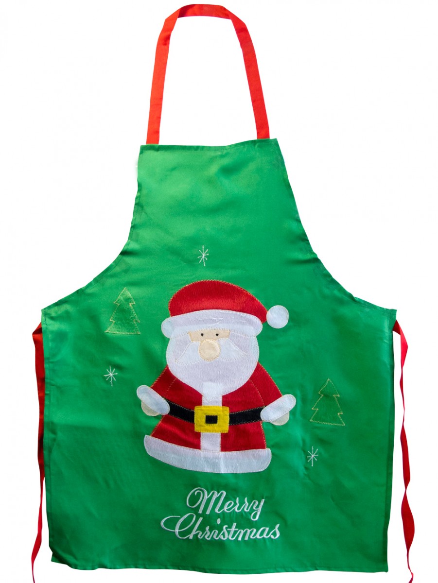 One of the most enduring parts of any holiday is the preparation of food to share with family, friends, and loved ones. Baking batch after batch of Christmas cookies, preparing the roast for Christmas dinner, enjoying a barbeque outside... each of these distinct smells and experiences conjures up happy holiday memories. Now you can have an official uniform for the designated Christmas cook! This green nylon apron features red ties at the neck and waist. A cheerful Santa Claus and embroidered snowflakes and Christmas trees add a festive look, while the greeting �Merry Christmas� spreads holiday joy to all. One size fits most.